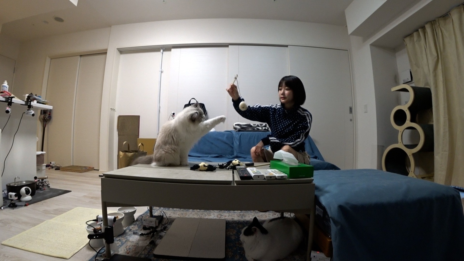 モンローに「僕がいてもごはんを食べたり、トイレもしたりしてたんで、ちょっとずつは慣れてきてくれるのかな」と変化を感じた前田は、思い切ってケージを開けてみることに。モンローが外に出た際に隠れる場所として、部屋の中に猫用のダンボールハウスを設置する気遣いも欠かさなかった。