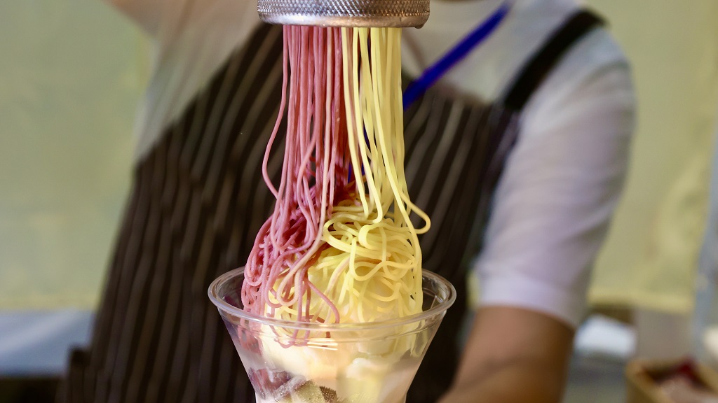 日本初!2種類のクリームを同時にかける、見た目も楽しいモンブラン。夏のさつまいも博限定の沖縄産紅芋クリームと洞窟熟成の信州産シルクスイートを使用し、信州産牛乳を使用したおいもジェラートとの相性もよく夏でもさっぱり食べられる。
