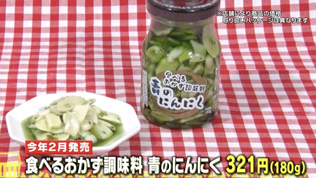 180g321円の『食べるおかず調味料 青のにんにく』は今年の2月に発売したばかりの新商品。にんにくのスライスに、わさびの葉っぱや青唐辛子が入った少しピリ辛な食べる調味料。舞さんは「白いご飯の上に“ご飯のお供”としてかけるだけでもおいしい」とコメントした。