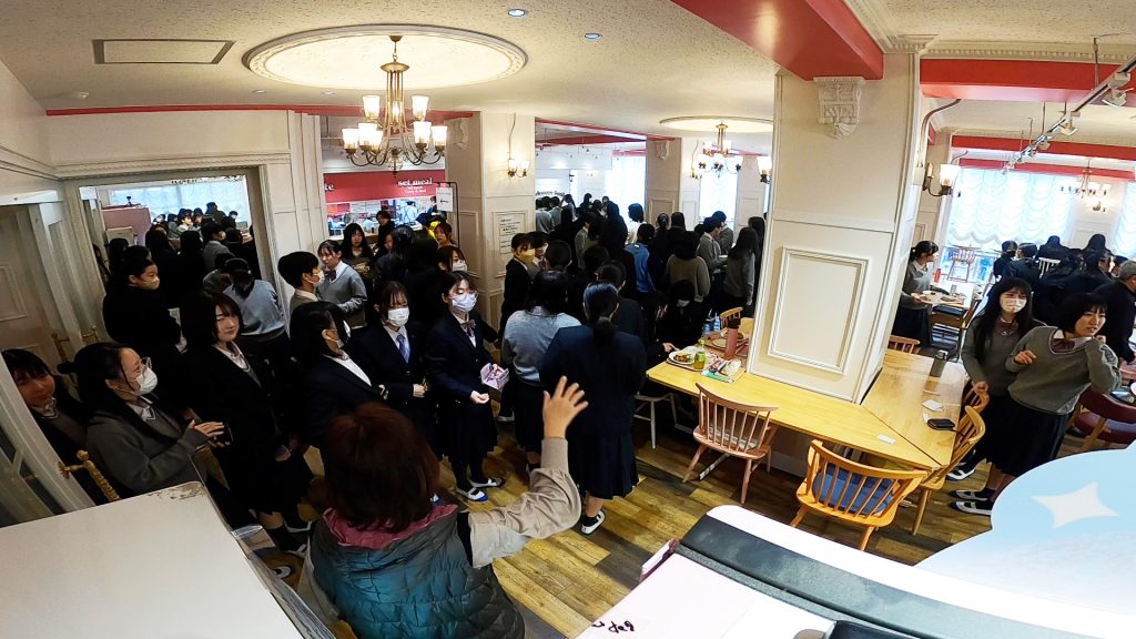 そこに休み時間の鐘が鳴り…、女子高生たちが食堂に向かって全力ダッシュで続々とやってくる。食券を買い求めるその勢いに圧倒されるマージュリー。生徒たちは、売り切れ前に何とか買おうと幻のメニューお目当てで走ってきたという。
