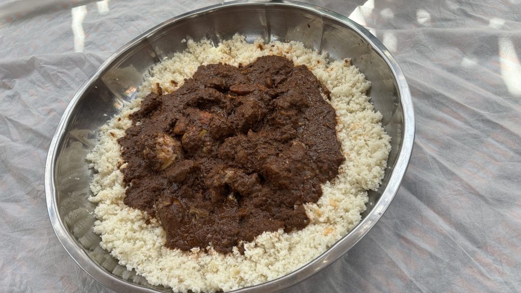 最後の朝食は、納豆を使う『マフェヤップ』。牛肉を豪快に揚げて、野菜とともにトマトペーストで煮込んだ料理。味の決め手はピーナツバター。そこにセネガルの納豆も加えて作った『納豆ノッコス』でアクセントをつけ、白米にのせたら出来上がり。