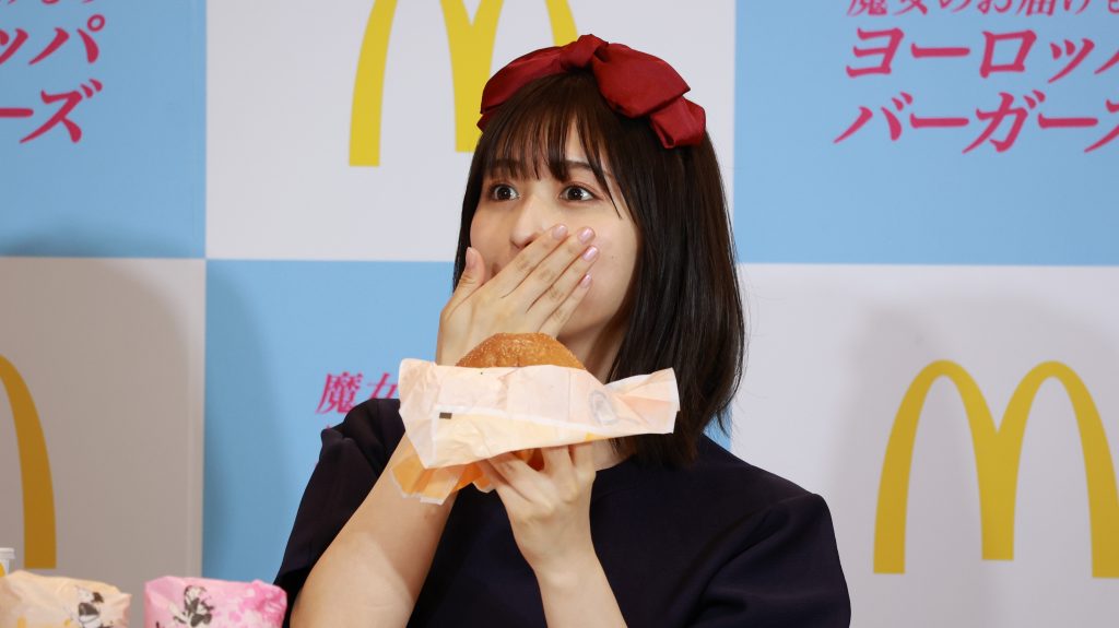 この日、原作『魔女の宅急便』とコラボレーションしたアニメーションによる、新商品の新TVCM『ヨーロッパバーガーズ篇』が会場で初公開された。(※放映開始:6月25日)このCMの1シーンを長濱が再現することに。新商品『ジャーマンポテト肉厚ビーフ』『ペペロンジューシーホットチキン』『ブイヤベース風シュリンプ』が入ったカゴを持って登場した長濱は「槙野さ~ん!マクドナルドからお届けものでーす!」とCMの“キキ”のセリフを言いながら、槙野にカゴを手渡した。