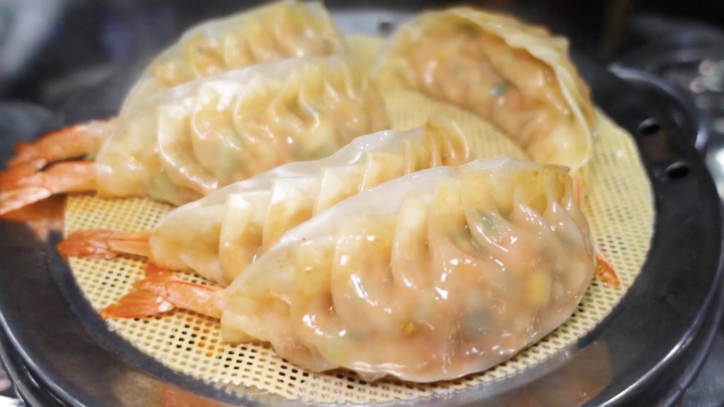 次に訪れたのは『マンドゥ(餃子)』専門店。目の前で調理される蒸したての餃子に「うわ~すご!」「デカ」と2人は大興奮。早速、肉ギョーザとエビ入りキムチギョーザを注文。