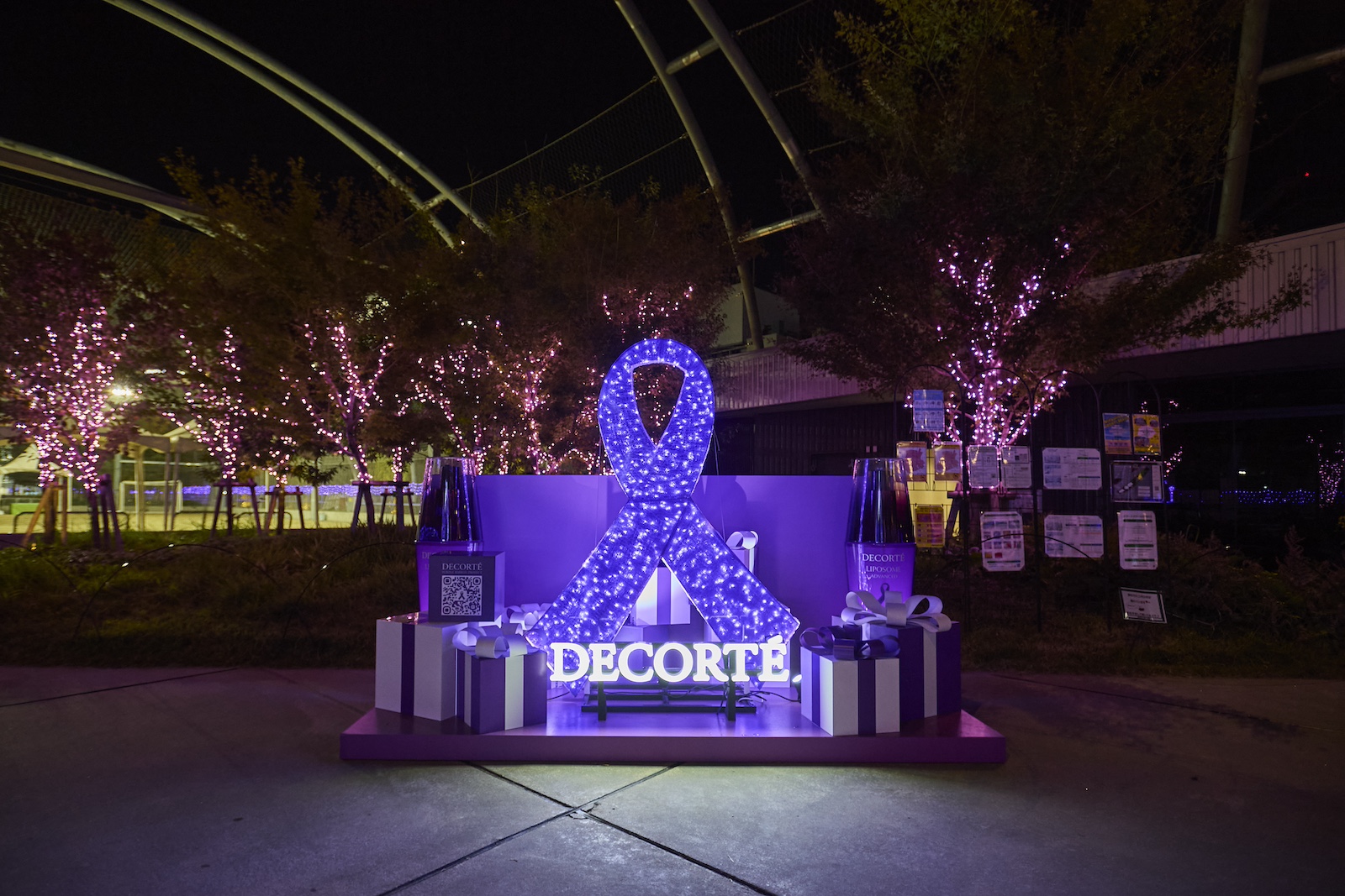 その内のひとつ、パープル・ライトアップ「DECORTÉ Purple Lightup 2024」は、“赤色と青色が混ざり合ってできるパープルのように、多様な人が混ざり合い、認め合い、大切にしあう。”というメッセージを込めた「LOVE PURPLE」をテーマに、運動のシンボルである「パープルリボン」と、ブランドを代表する“リポソーム美容液”を象徴するパープルのカラーで宮下公園を彩る。