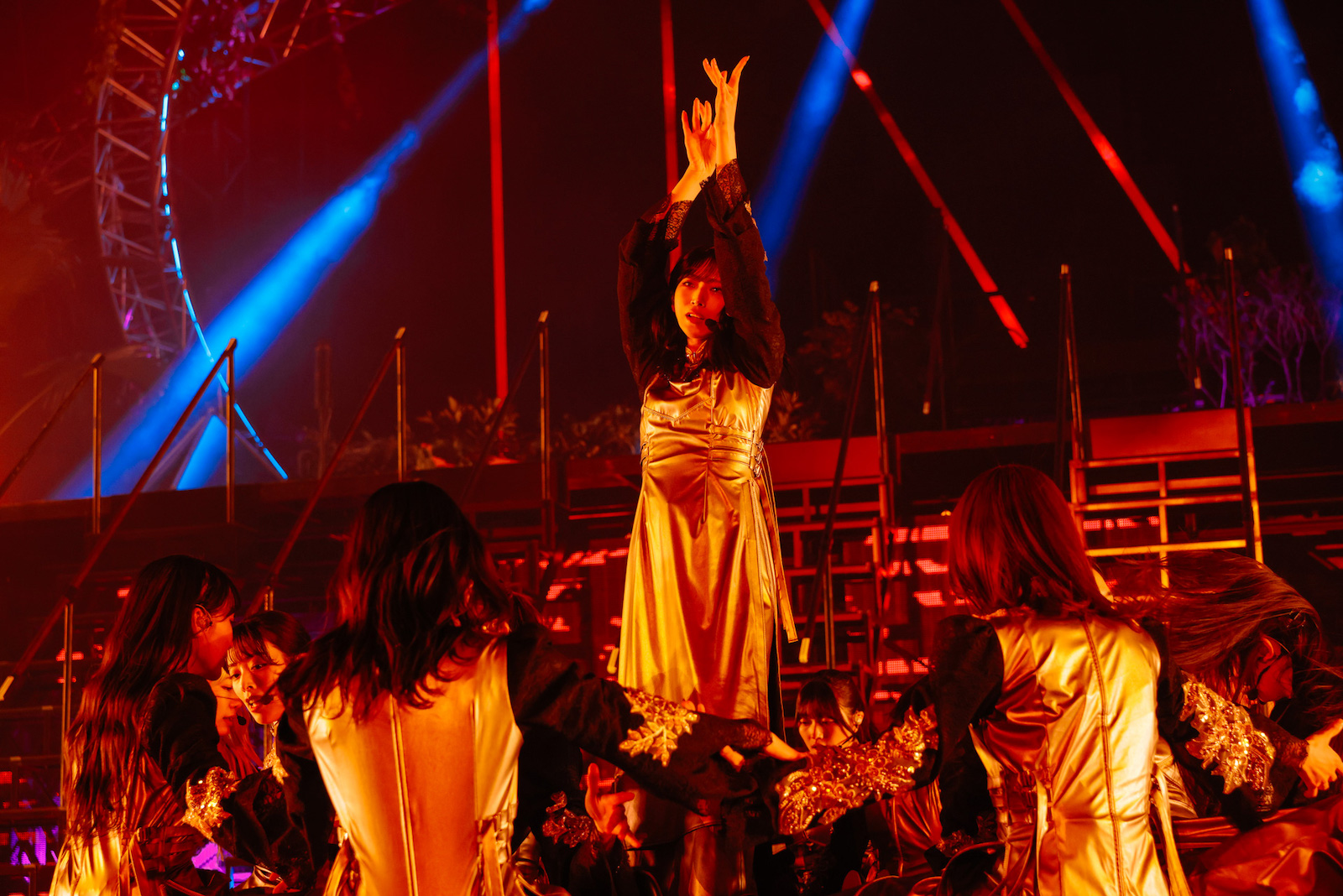ステージと客席がクラップでひとつになる「マンホールの蓋の上」で会場のボルテージが上昇すると、続く「もう一曲 欲しいのかい?」でその熱気はさらに高まることに。森田のソロダンスを冒頭にフィーチャーした「承認欲求」や山下のセンターとしての存在感が増し続けていることを提示する「自業自得」と、ヒット曲が連発されるにつれて客席の盛り上がりに拍車がかかり続ける。