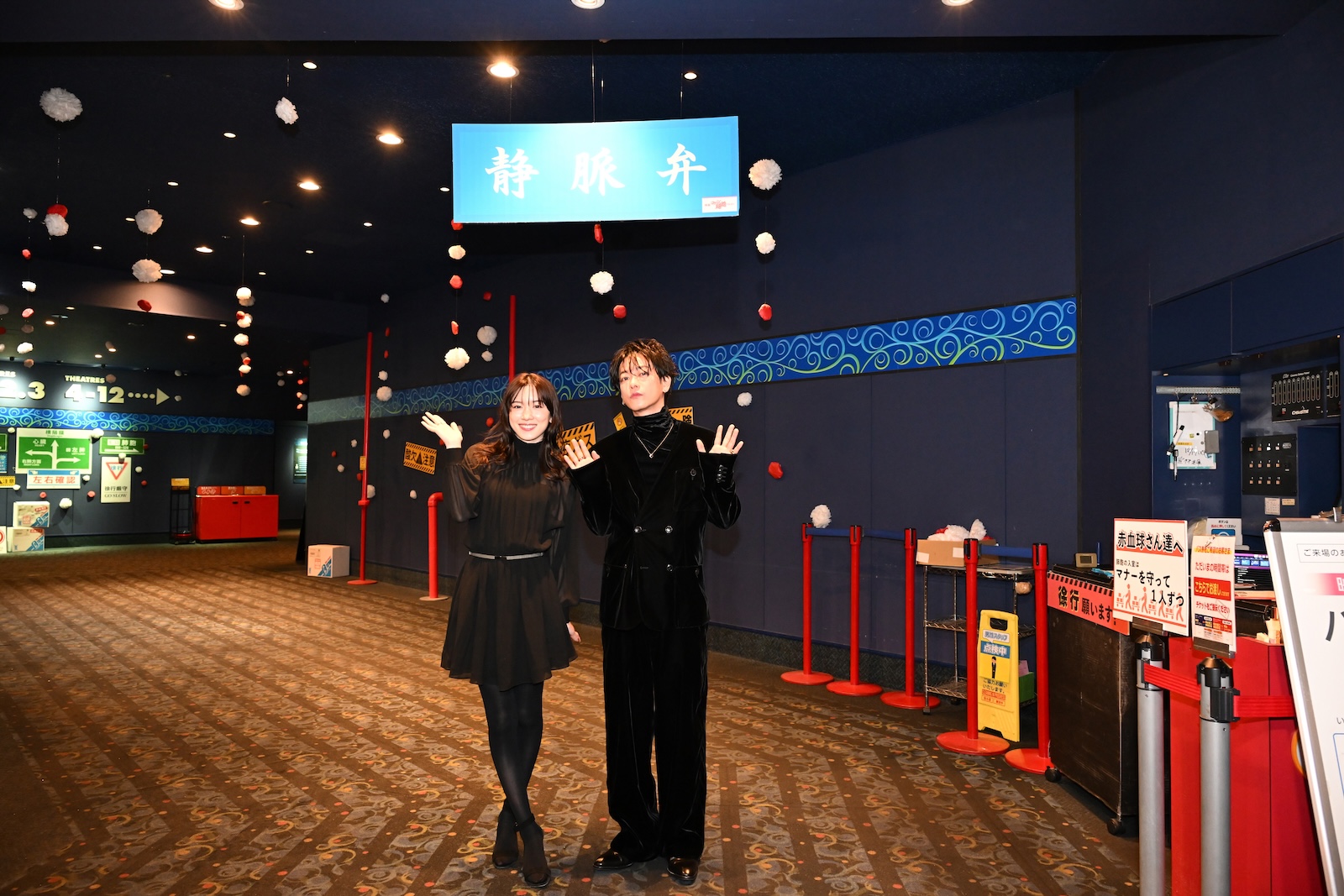 今回の舞台あいさつ会場となったMOVIX堺は、館内所狭しと彩られた見事な『はたらく細胞』仕様の装飾で、SNSでもたびたび話題になるほど注目されている。永野は「『静脈弁』と書かれた入口とか、天井からぶら下がる赤と白の飾りとか、撮影で実際に使われた小道具もたくさん置いてあって、スタッフさんも赤血球の恰好をしてくださったり…ありがたいです!」と感激の様子。佐藤も、「すごく広い空間を使って、映画館の装飾を体の中みたいにして、盛り上げていただけてうれしいですし、光栄です!僕たちが撮影した時の小道具もそのまんまで、懐かしかったです」と、劇場へ感謝を伝えた。