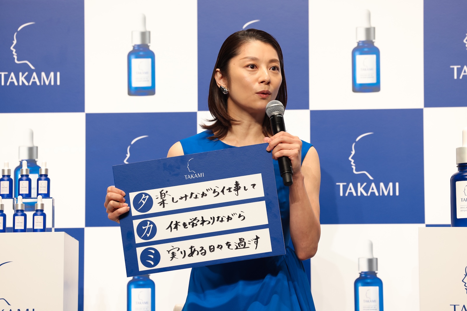 小池栄子が福士蒼汰、松岡茉優と共に『タカミスキンピール20周年』記念イベントに登場。新CMの撮影エピソードや「2025年をどんな年にしたいか?」をあいうえお作文で披露した。