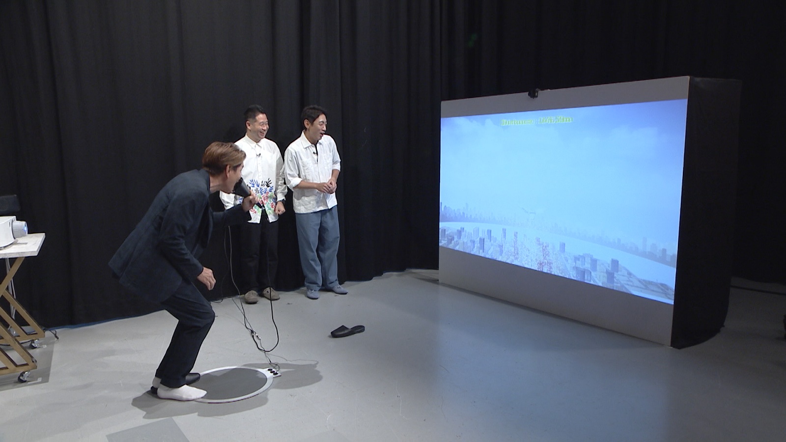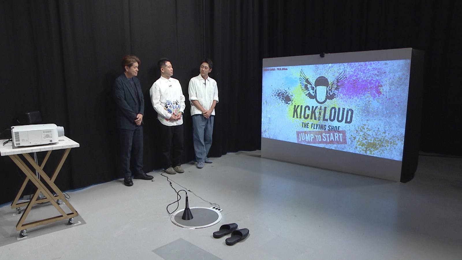 『キックアンドラウド』はハンマー投げから着想を得て作ったというが、飛ばすのは“羽が生えたスリッパ”。スリッパをより遠くに飛ばすゲームで、まずプレイヤーはマットの上を走ることで、エネルギーをためる。そして、画面に向かって足でスリッパを飛ばす。さらに、ハンマー投げのごとく叫ぶと、声の大きさに応じて飛距離が伸びるという仕組みだ。
