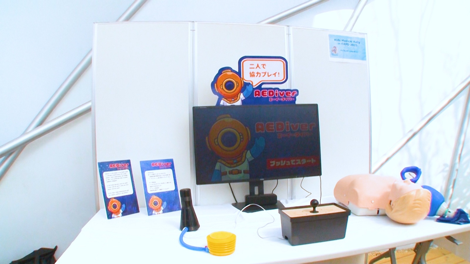 主催者は「今回、“いのち”が万博でテーマになっていますので、我々としても命を救うとか助けるとか、そういったことをメッセージとして伝えていきたいと思ってます」と語る。そんなイベントに用意した神のゲームは『AEDiver』。このゲームのテーマは心停止した急病人への『胸骨圧迫』のやり方と、『AED』の存在を知ってもらうこと。コントローラーは、ビニールプールに空気を入れるポンプと、左右に動かすレバーを使い、2 人で協力して行うリズムゲームだ。