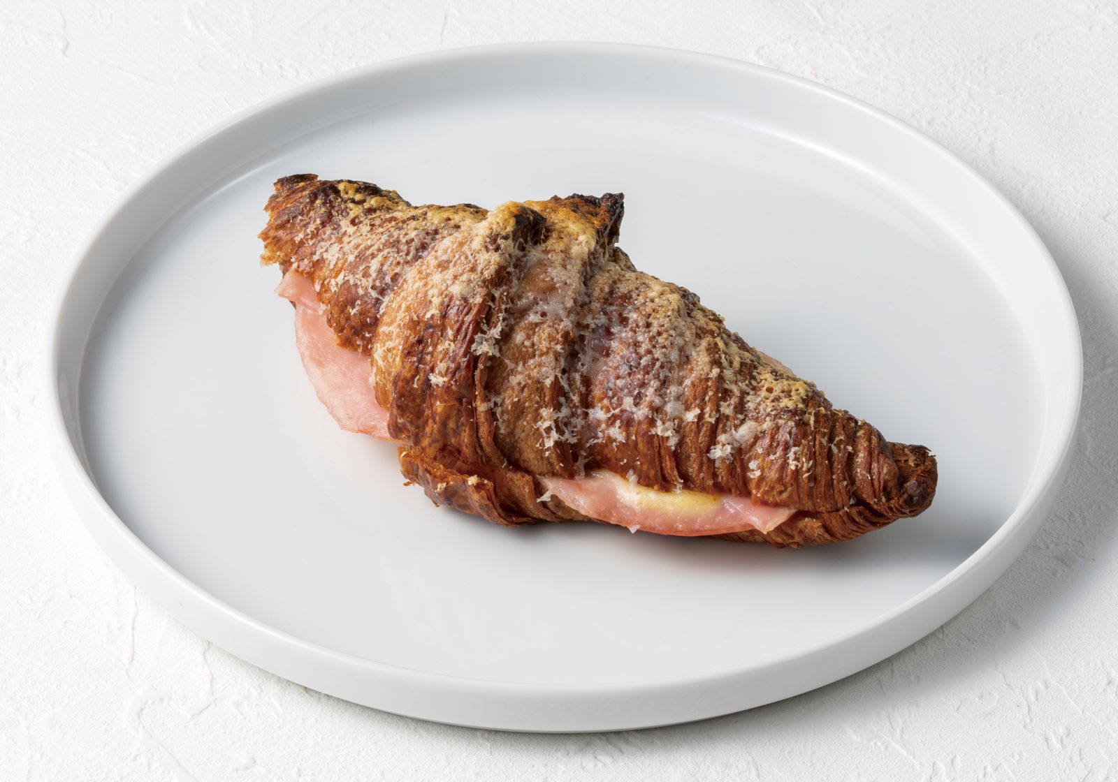 店舗で焼いたクロワッサンにホワイトソース、チーズ、ハムをはさんで焼き上げたクロックムッシュ。