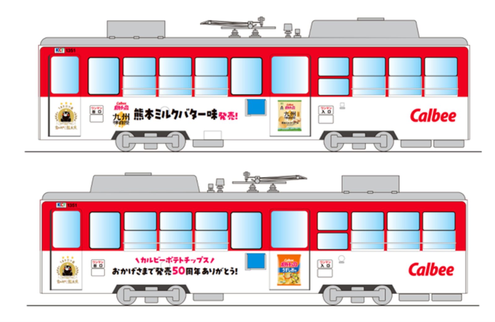 「カルビーポテトチップス」は1975年に誕生し、2025年9月で発売50周年を迎える。「カルビーポテトチップス」発売50周年と新商品『ポテトチップス九州味自慢 熊本ミルクバター味』の発売を記念して、カルビーが初めて熊本市電とコラボレーション。2025年10月10日(金)から2026年3月31日(火)までオリジナルデザインの車両「カルビーポテトチップス50(ゴー)!GO(ゴー)!号」が運行される。