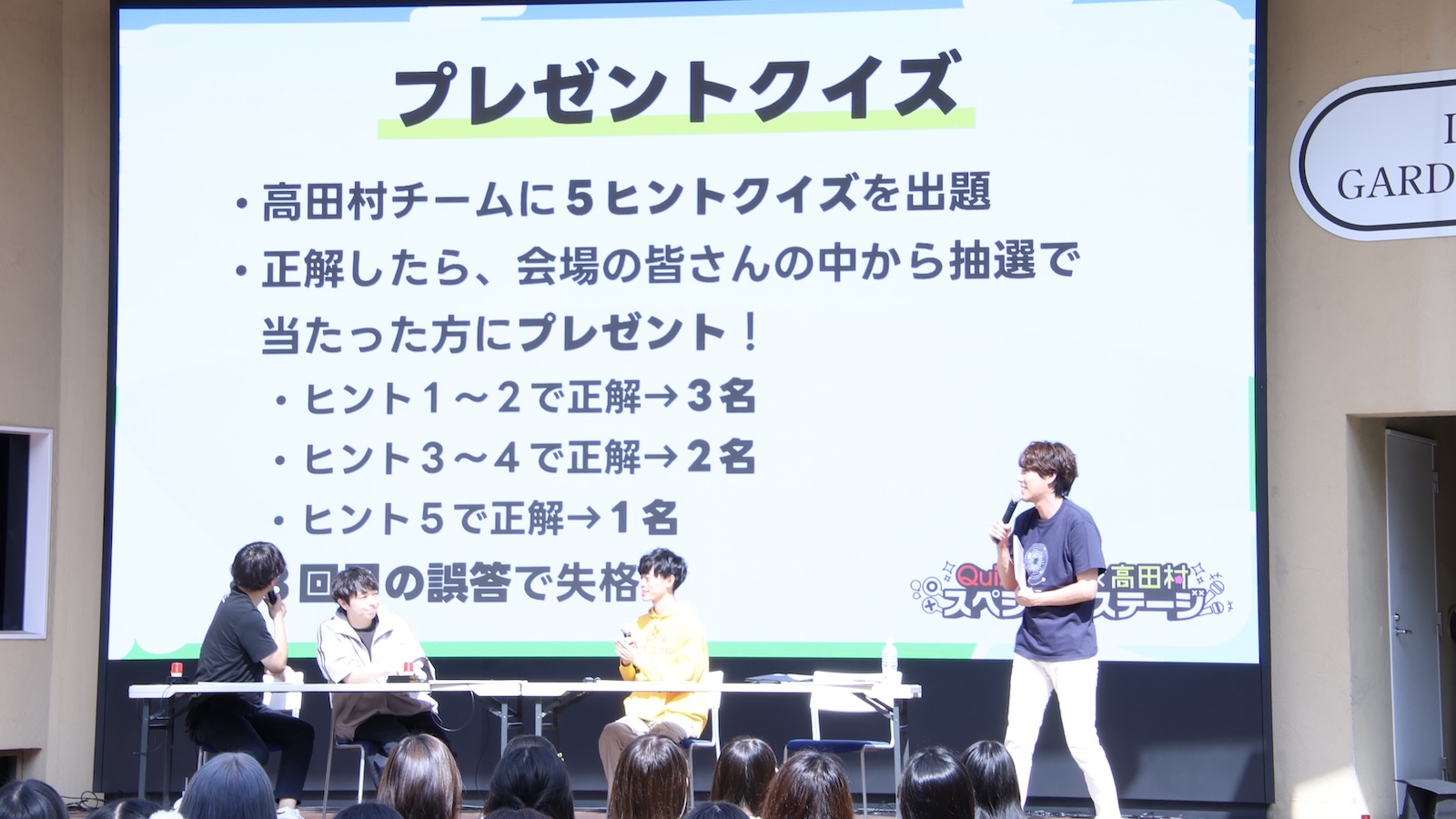 そんな、ファンとの絆も再確認できる本イベント3つ目の企画は【プレゼントクイズ】。高田村チームに5つのヒントが順に題され、少ないヒントで正解するほど会場のファンへのプレゼントが増えるというもの。ここまでのクイズはある意味でファンとの戦いでもあったが、「今度ばかりは味方だから(笑)」と進行の須貝も温かい目で見守る。ただ、その分早めに正解することへの期待も高まり、高田は「(プレゼント)は無いものだと思って見ててください」とうれしい悲鳴をあげていた。
