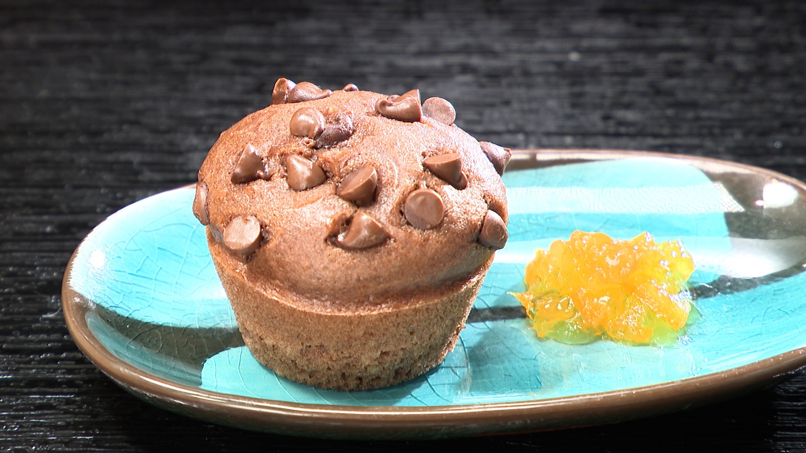 新メニューにはスイーツも。チョコとオレンジの『マフィン』は1個150円。セミドライオレンジピール4g、チョコレートのペースト12gなどの材料を、もちろんみっちり計量して焼き上げる。