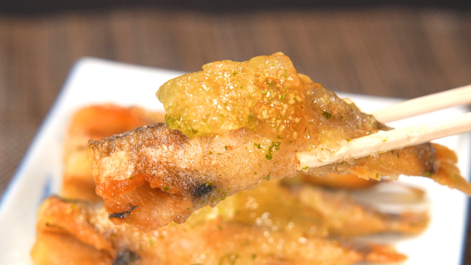 さらに、福島名産の魚・メヒカリを唐揚げに。東浪のアイデアでジュレがけにする。東京・赤坂のフレンチで食べたジュレを「勘で再現する」とのこと。お湯にゼラチンを入れ、レモン果汁と、約10種類のスパイスなどが入った『マジックソルト』を加えたら、冷ましてゼリー状に。これをメヒカリにたっぷりかける。「メヒカリの味を立ててさっぱりレモンがきいて」と東浪。