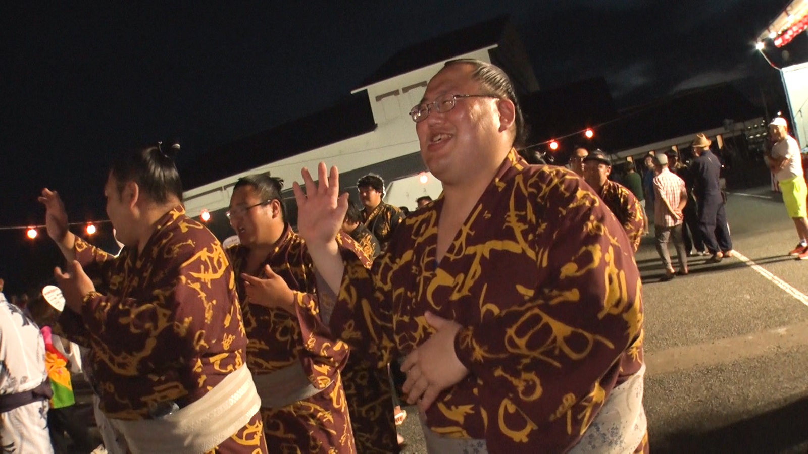こうして腹ごしらえして臨んだ、盆踊り大会。今年でちょうど50回目の開催とのこと。職場の同僚で組んだチームや100人以上のメンバーを擁するチームなど、25団体、約700人が参加する。「震災が起きてから、より玉ノ井部屋と相馬の絆が強くなった」と東浪。合宿期間、毎日差し入れを届け応援してくれた相馬の人たちへ、感謝の気持ちを込めた踊りで、優勝を目指す!