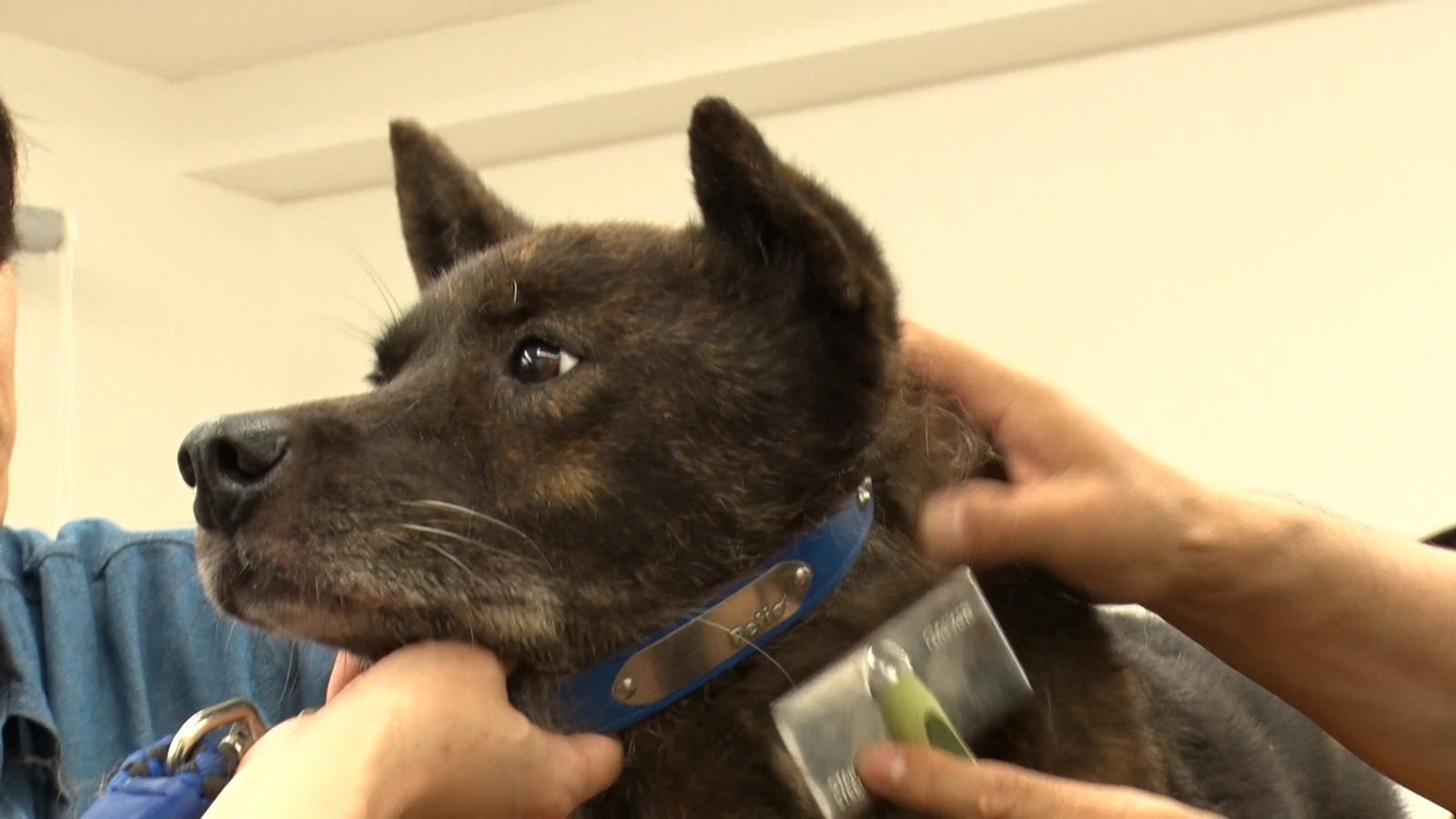 こうして1匹目のブラッシングを終えた2人は、続いて甲斐犬のブラッシングにも挑戦。見ず知らずの人に警戒してか、思わず噛(か)む仕草を見せてしまう甲斐犬だが、ボサボサの毛玉を取り除きたい2人は、なんとか台に甲斐犬を乗せトリミングを行うことに。