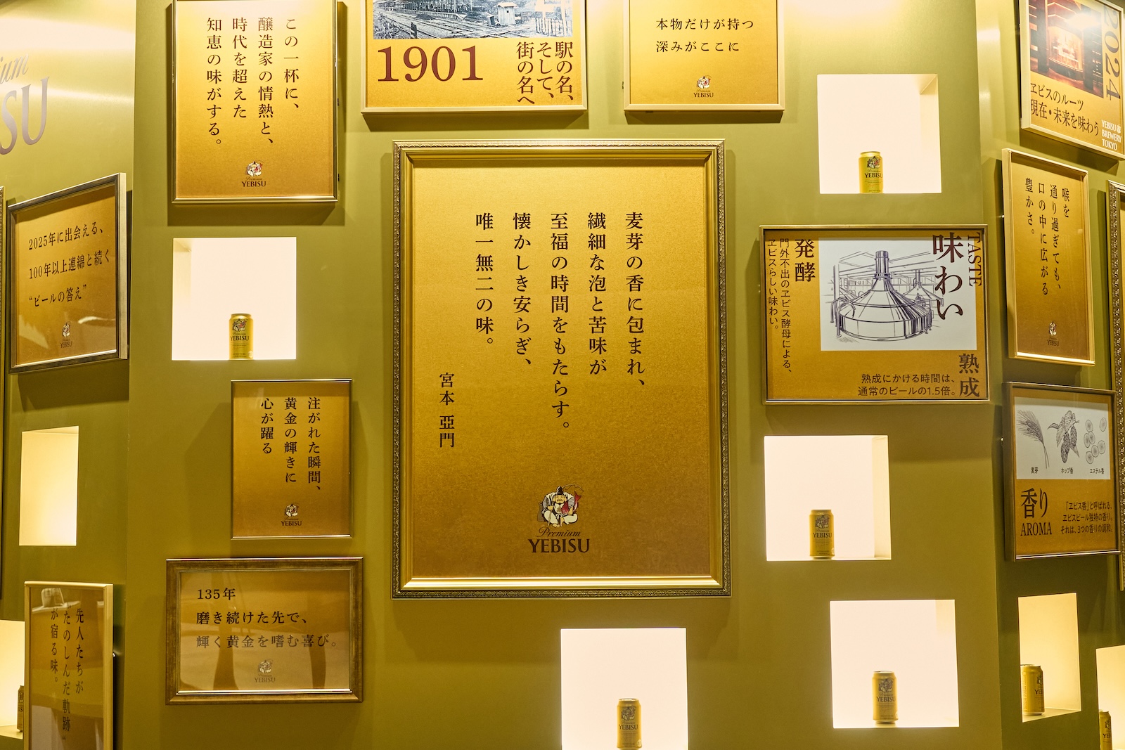「ヱビスビール 黄金のBAR」では、135年磨き続けてきた今のヱビスの最高到達点の味わいをその場で飲む体験ができるとともに、ヱビスのブランドアンバサダーである山田裕貴をはじめ、宮本亞門、谷尻誠、高山都、笹川友里といった多岐にわたる分野で活躍する5名に、それぞれヱビスビールの唯一無二の美味しさを表現いただいた”金言”を展示。