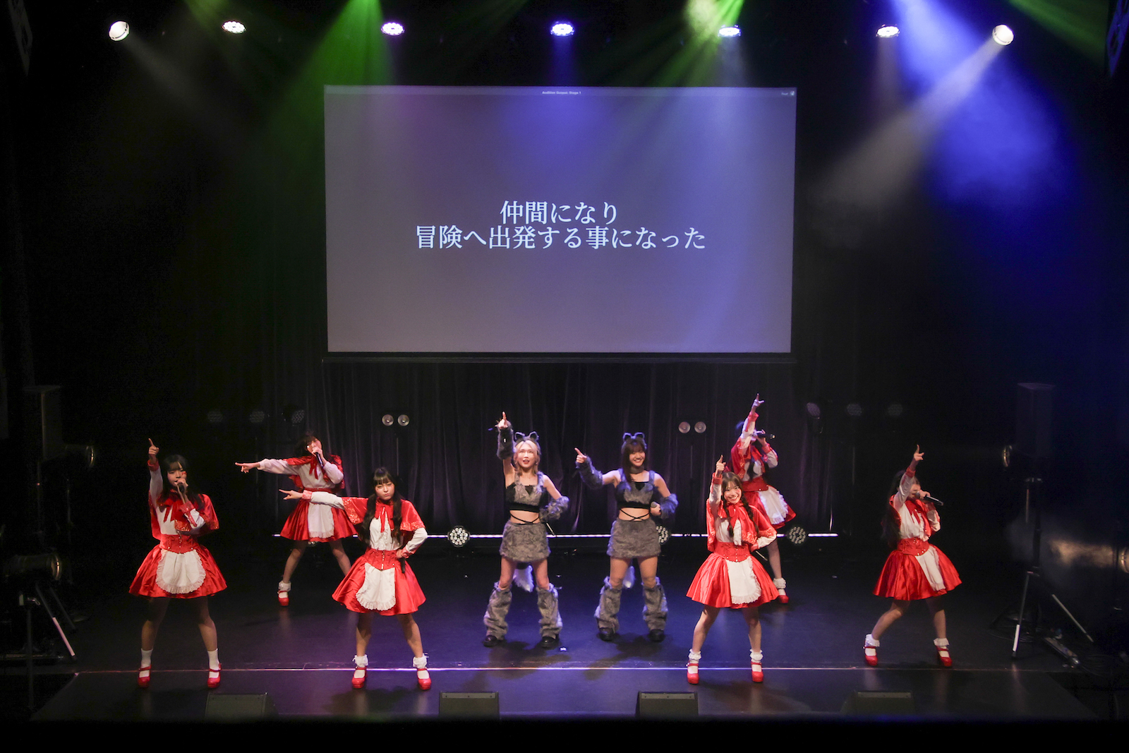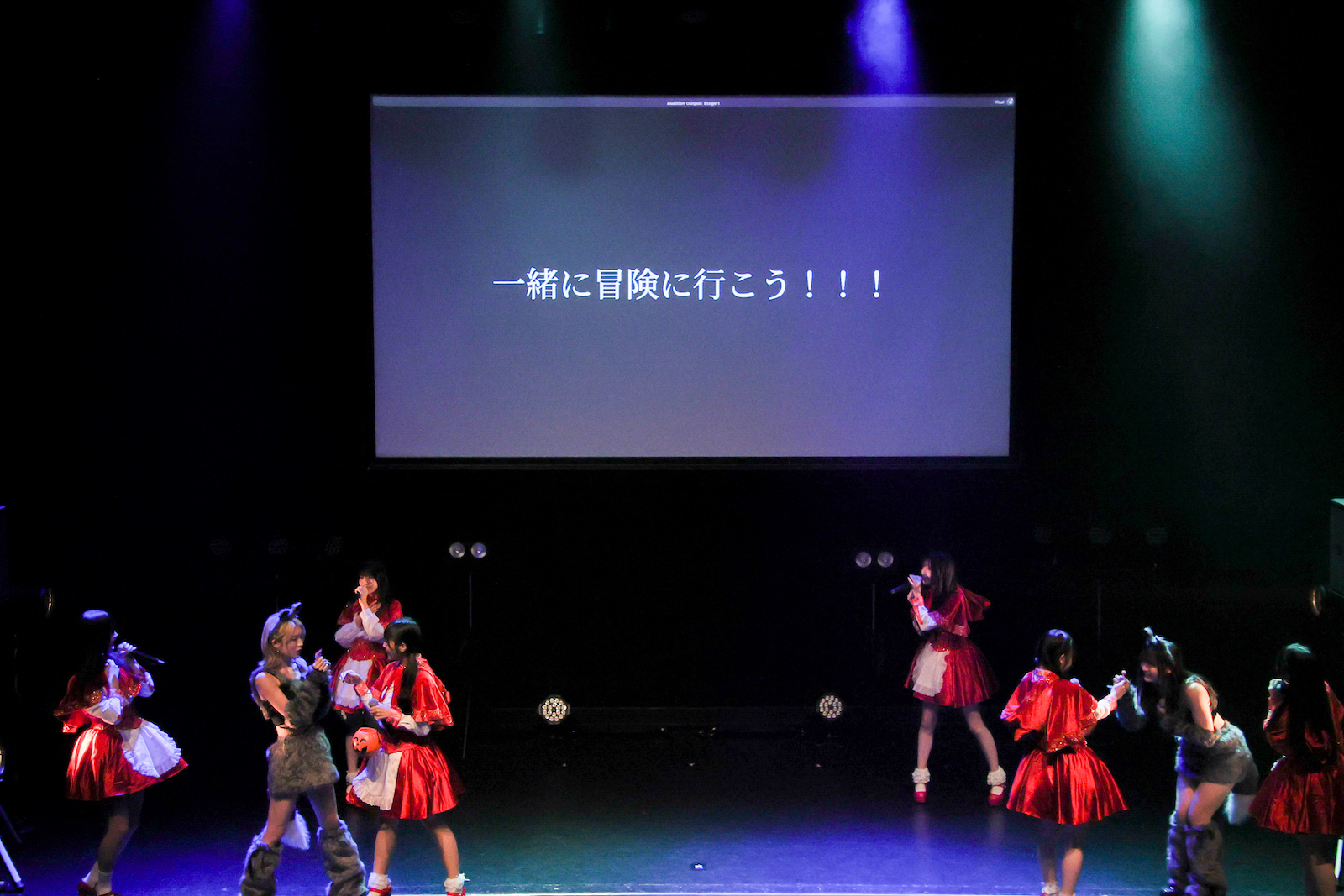 楽曲中、“オオカミと赤ずきんの物語”を感じさせる振り付けやフォーメーションで、普段と異なるLinQで魅せる。すると、赤ずきんの“みなずきん”(有村)と“あかずきん”(華山)が、襲い掛かろうとするオオカミの“らなオオカミ”(海月)と“れいオオカミ”(黒田)にお菓子を渡す。スクリーンには「一緒に冒険に行こう!」の文字が。
