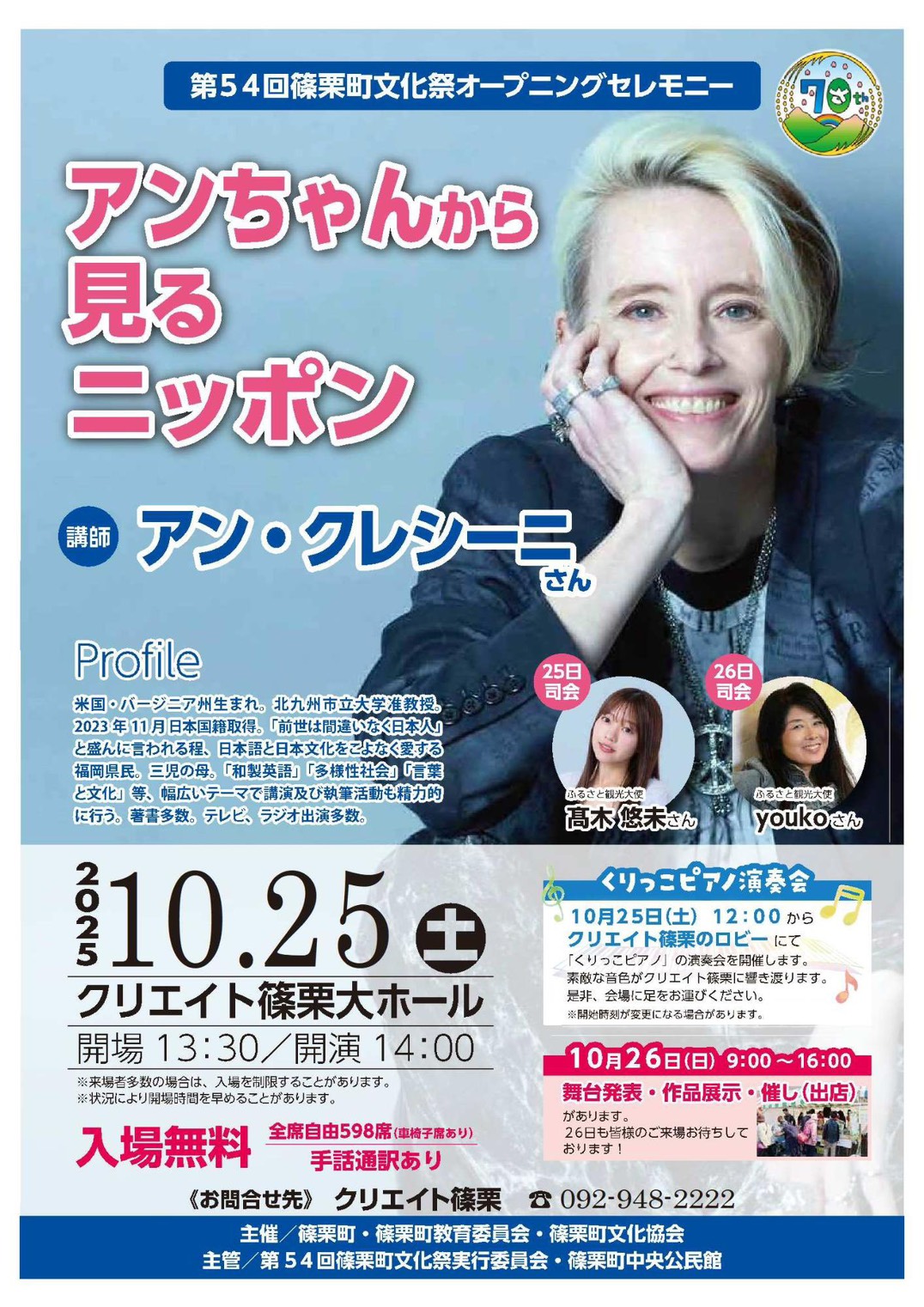 『篠栗町文化祭』は「学び、創造、向上」といった学ぶ心を大切に育てながら、豊かな文化を創造するという目的のもとに毎年行われているイベント。開催期間をとおして、各サークルや町民の方々の成果が展示や舞台で披露される。今年は10月25日(土)26日(日)に開催。