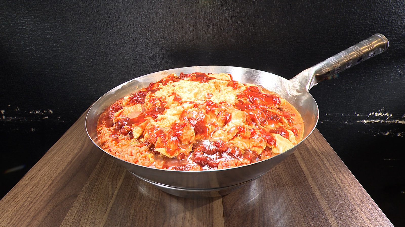 そんな店のグランドメニューの中で、常連のおすすめは「オムライス」とのこと。『自家製トマトソースのとろとろオムライス』は900円(※平日ランチ価格)。だがこれには“どデカバージョン”があり、それは『オムライス超』(3,000円 ※混雑状況により提供できない場合があります)。まずはフライパンの底でたっぷりのバターを溶かし、ごはんを約10合投入。味付けひき肉、ネギ、ケチャップ1kg、自家製の甘めトマトソース1kgを加え、さらに追いバターをして炒(いた)める。別のフライパンで、卵20個を使ったとろとろのオムレツを作り、ライスの上へ。自家製の甘めトマトソースをかけて完成。