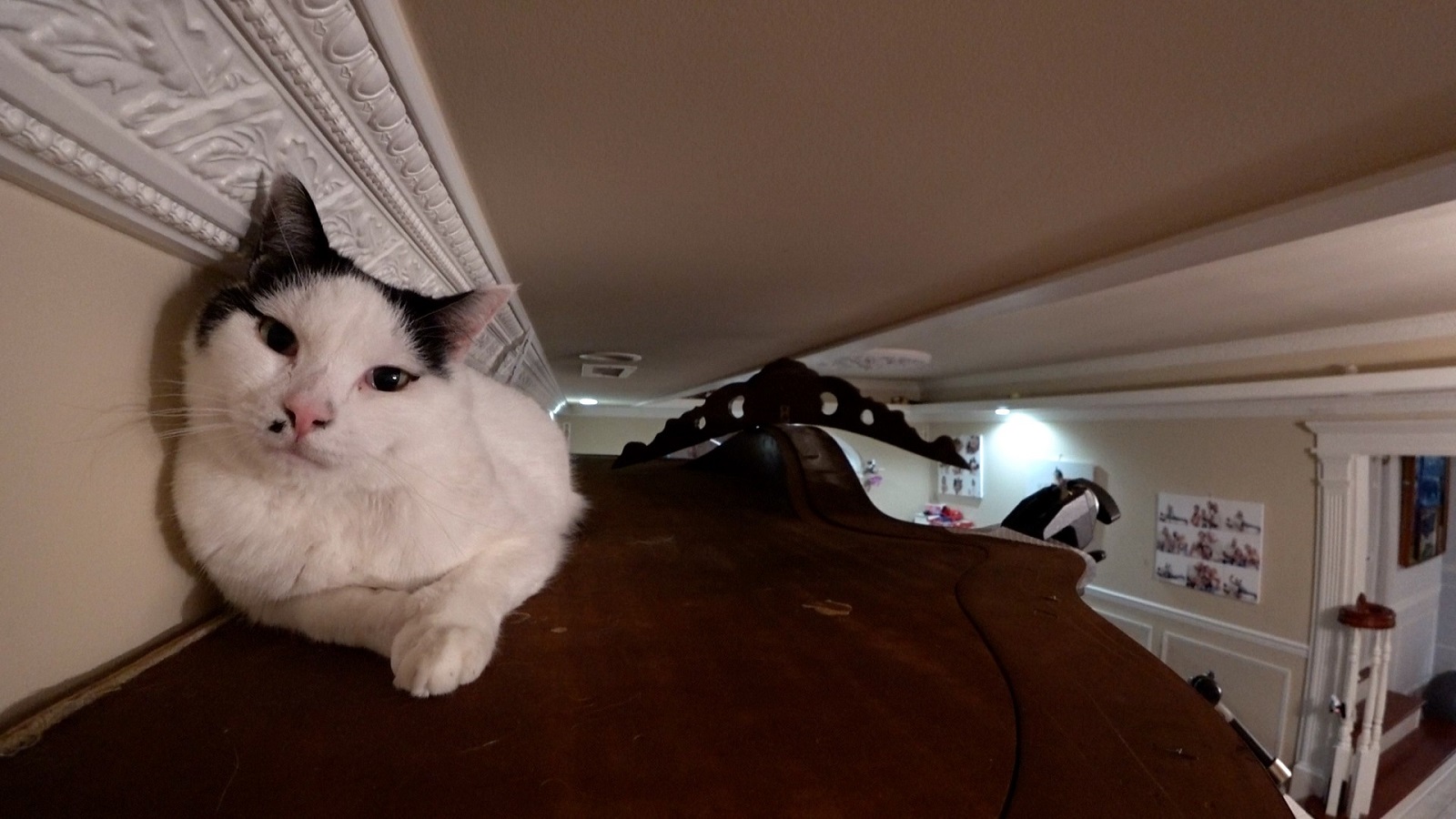 なでなでに成功した芳根は、モンローの人なれに向けたもう1つの課題にも挑戦。大家族かつ先住猫にも囲まれた環境のためか、常にキャットタワーの最上段にいるモンローに部屋の中を動き回ってもらうため、芳根はラミレスが席を外した状態でモンローと向き合った。