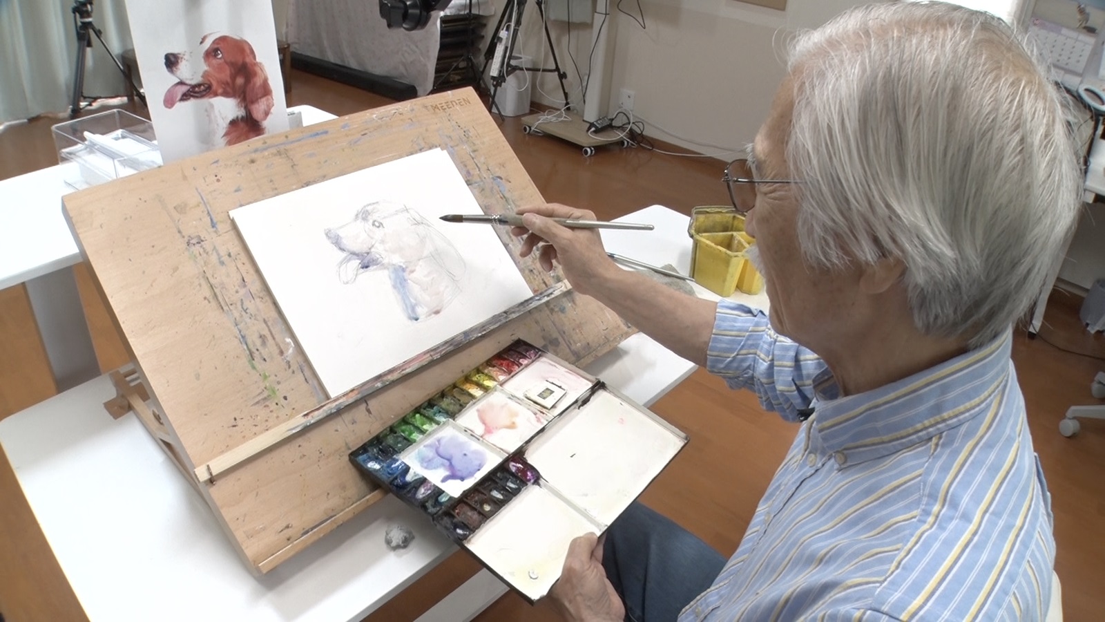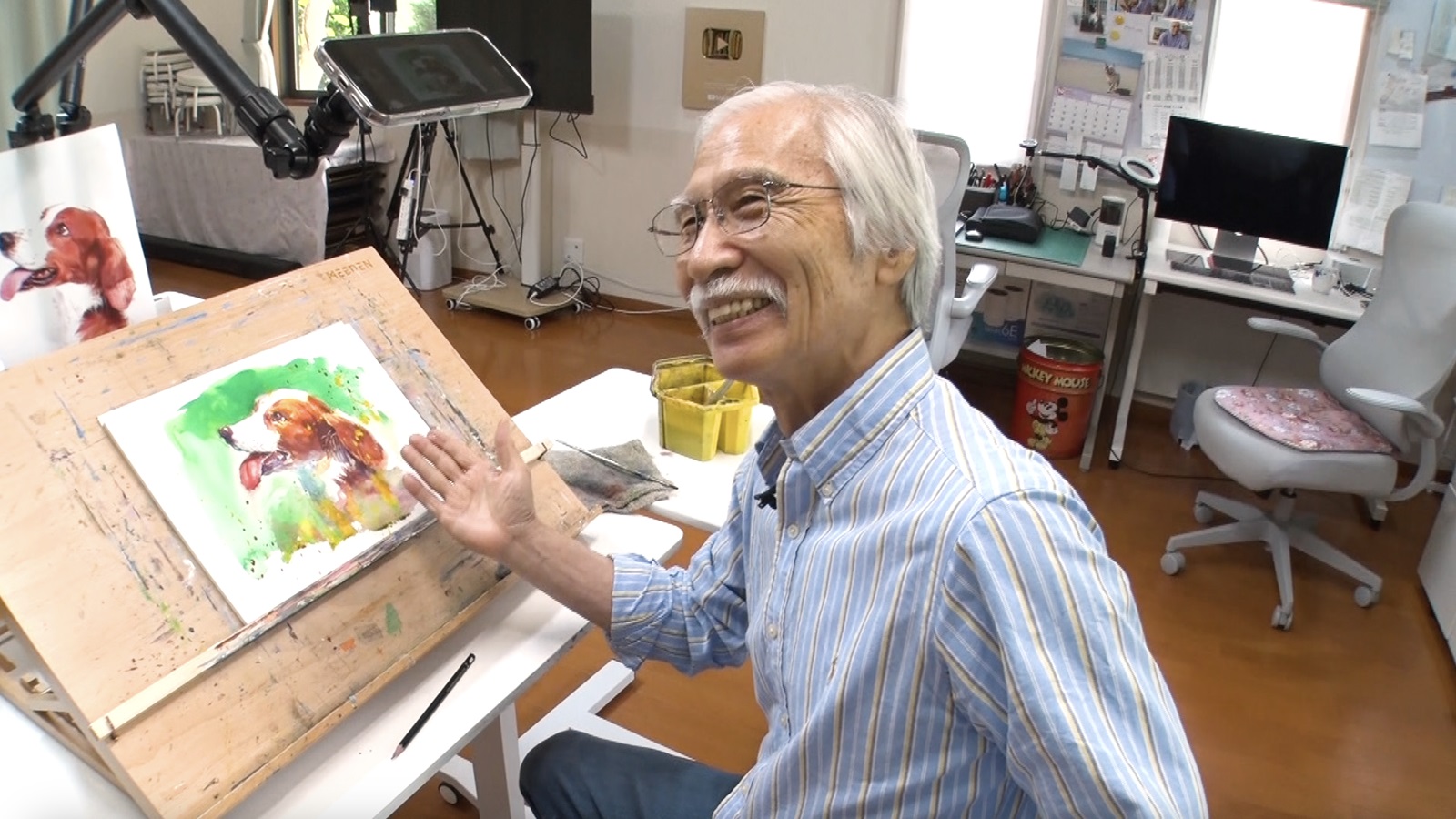 実は柴崎さんの本業は絵画講師。和光大学芸術学科を卒業した23歳の時、絵画の大手通信教育機関に就職。述べ15万点以上の絵画作品を添削し、退社するまでの40年間トップ講師の座を守り続けた。その絵画指導への情熱は冷めることなく、現在はYouTubeでも絵画の添削を行っている。そんな柴崎さんの、“柴崎現象”をスタッフも体験させてもらうため、犬の顔の描き方を見せてもらうことに。