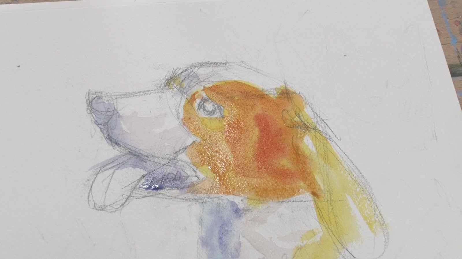 続いて、色塗り。水彩画は、明るい色から暗い色を重ねて行くのが基本。今回お手本にした犬の写真の場合、紙を活かした白の次に明るいのは白い毛並みにある影の部分。その部分を神は「日影といったら寒いというイメージなのでブルー系で」と色味を作っていく。他の影部分も同じようにブルー系で塗り、次に明るい茶色い毛の部分に、徐々に暗くなるように色を重ねていく。さらに、背景を塗ることで、白い毛の部分も際立たせることができる。