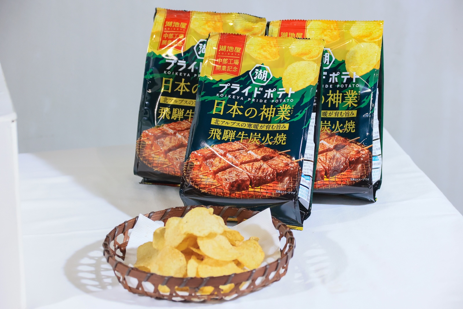 さらに、中部工場(岐阜県海津市)を開業することを記念して、岐阜県を代表する食材“飛騨牛”を使用した逸品「湖池屋プライドポテト 日本の神業 飛騨牛炭火焼」を2025年11月3日(月)より全国コンビニエンスストアにて先行発売、2025年11月10日(月)より全国スーパーマーケット他一般チャネルにて発売。