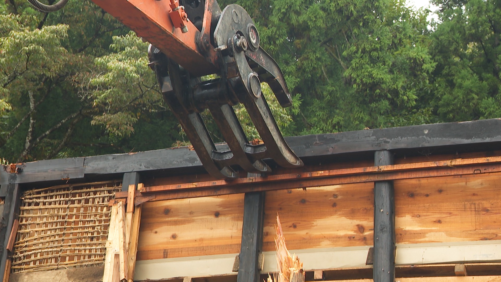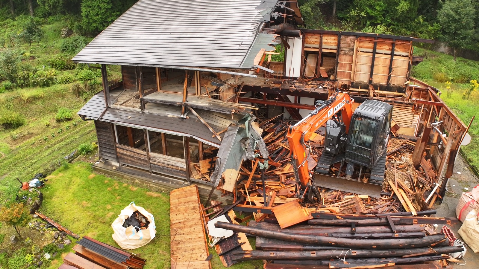まずは材料となる木材の調達。3人が早朝からやってきたのは新潟県長岡市。築約100年の古民家を解体中だという。今回はその作業を手伝い、出てきた古材を再利用させてもらうことに。