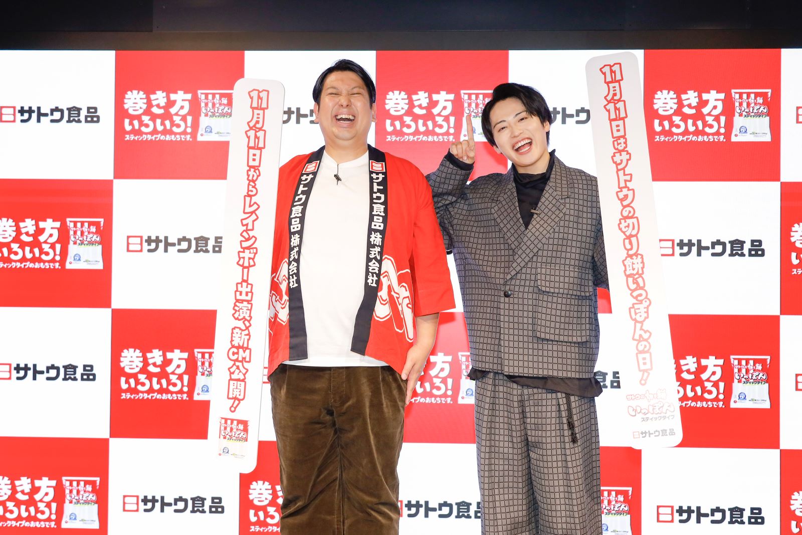 お笑いコンビ・レインボーの池田直人とジャンボたかおが、11月10日に都内で行われた『サトウの切り餅いっぽん新CM発表会』に登壇。新たな餅の楽しみ方“手巻き餅”を披露した。