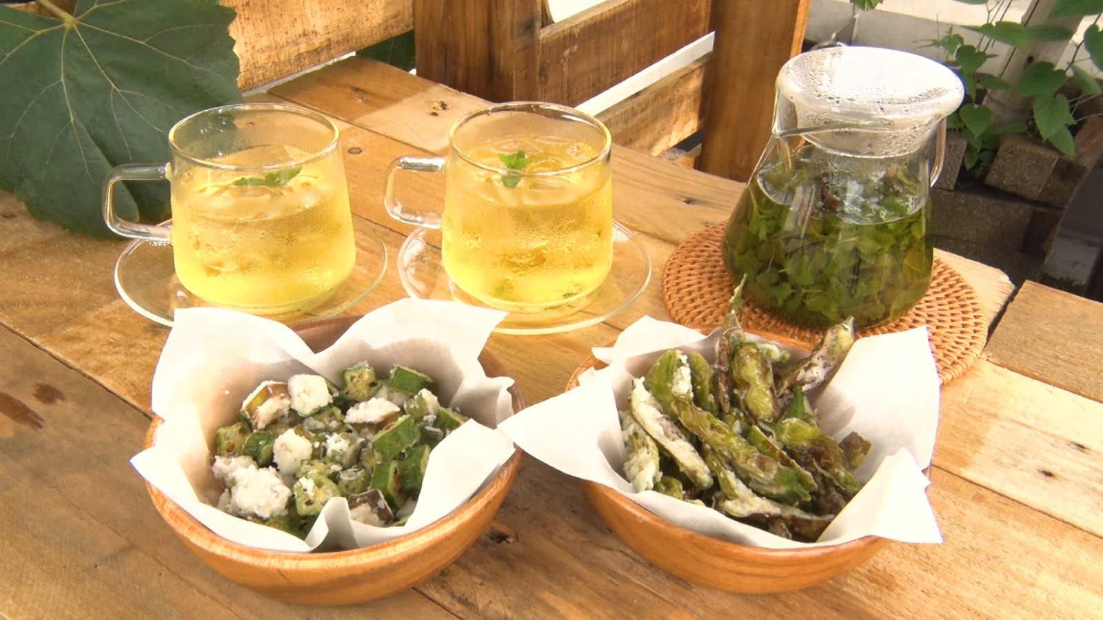 さっそくプレオープンということで、お茶を楽しむことにした松島と篠塚。ベース基地で育てたミントでお茶をいれ、シシトウ、オクラを茶菓子にすることに。シシトウとオクラは衣を付けて揚げ、サクサクのチップスに。ミントはお湯に浸して5~6分放置するとおいしいミントティーになる。今回はアイスで。「お疲れ様でした」とカップを合わせる2人。ミントの香りとさわやかな味を楽しんだ。「これです、これです、僕が求めてたのは」と、茶屋の実現に感慨もひとしお。そして、シシトウのチップスを食べた松島は、「これいいな。後からピリッと来る辛さと(ミントティーが)合うわ」と感嘆。「上質なアフタヌーンティーだね」と満足そうな様子だった。