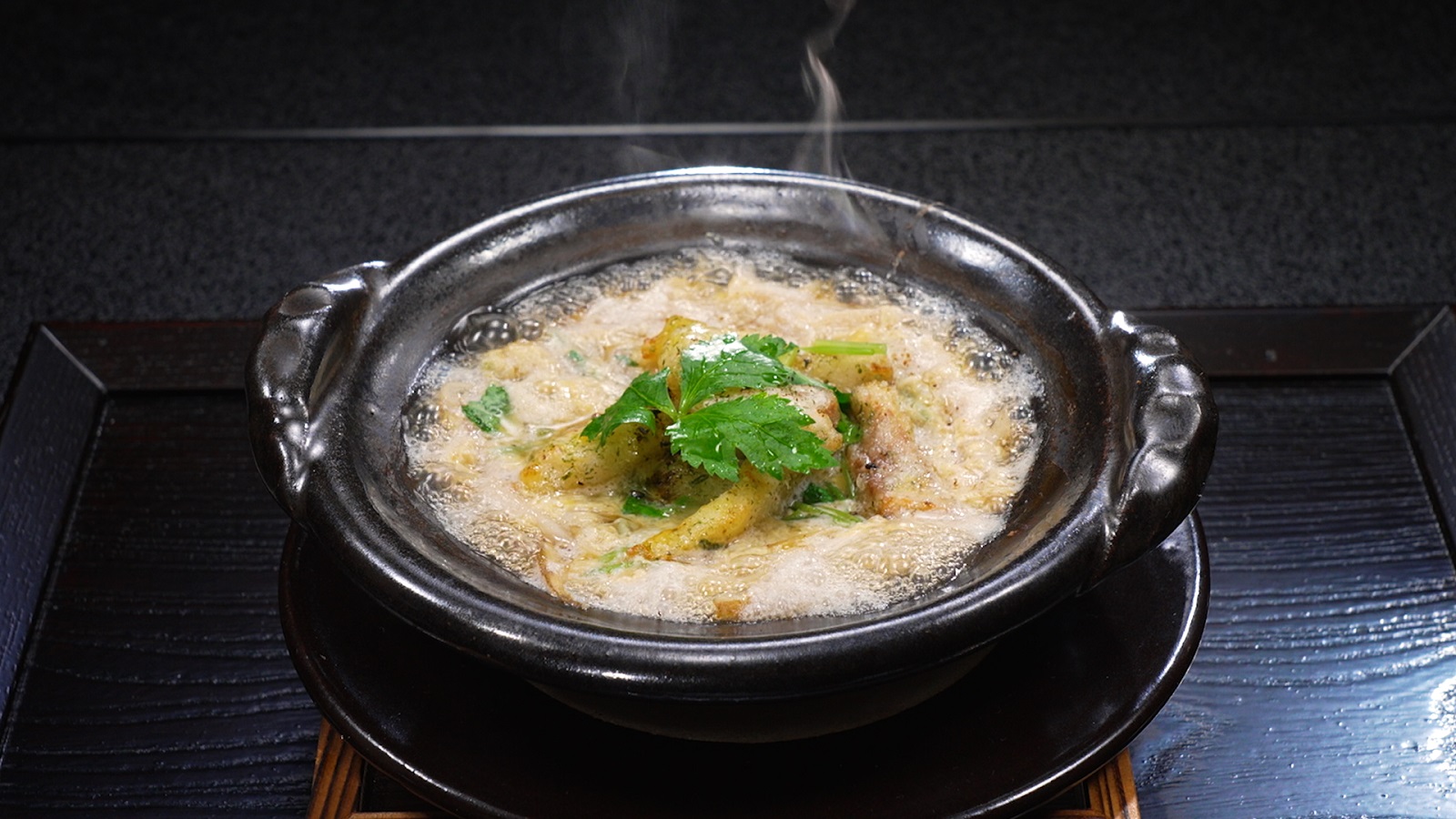 最後の料理は『アメリカナマズの柳川鍋』。ナマズは昆布締めにして下味をつけたあと、弾力を生かすように繊維に沿って細切りに。そして、かたくり粉に青のりを加えたものをまぶして揚げる。骨は焼いて臭みを取り、臭み消しの焼きネギと昆布と一緒に出汁(だし)を取る。出汁をこしたら、しょう油、みりんで味をつけ、ナマズ、ごぼうを煮立てて、卵でとじれば完成。ごぼうも泥の中で育つのでナマズと相性が良いそうだ。