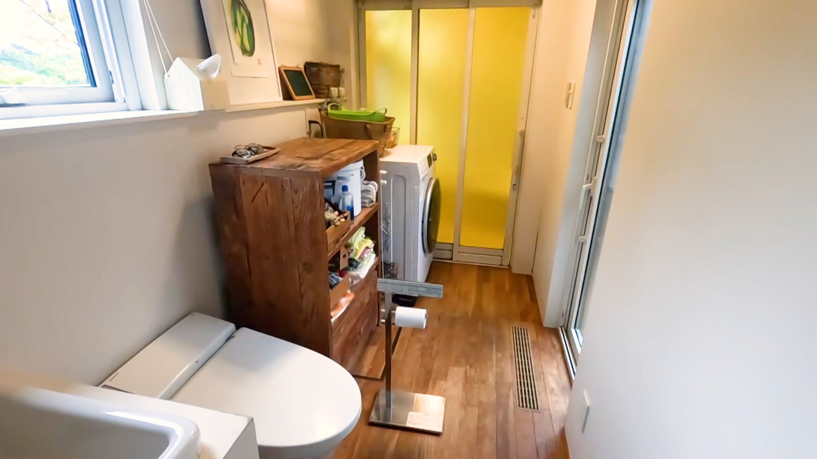 最後に、亀の尻尾に当たる独特な造りの水回りへ。圭司さんが「どうなっているとも思いますか?」と言うと、真栄田は「うちの一級建築士が」と内間に振った。内間は「時期によるんですけど、たまにこうやって上がったり下がったりする?そういう部屋?」と言って腕を動かしてみせた。真栄田が「あの、とってもいい人なんです」と言うと、場は笑いに包まれた。