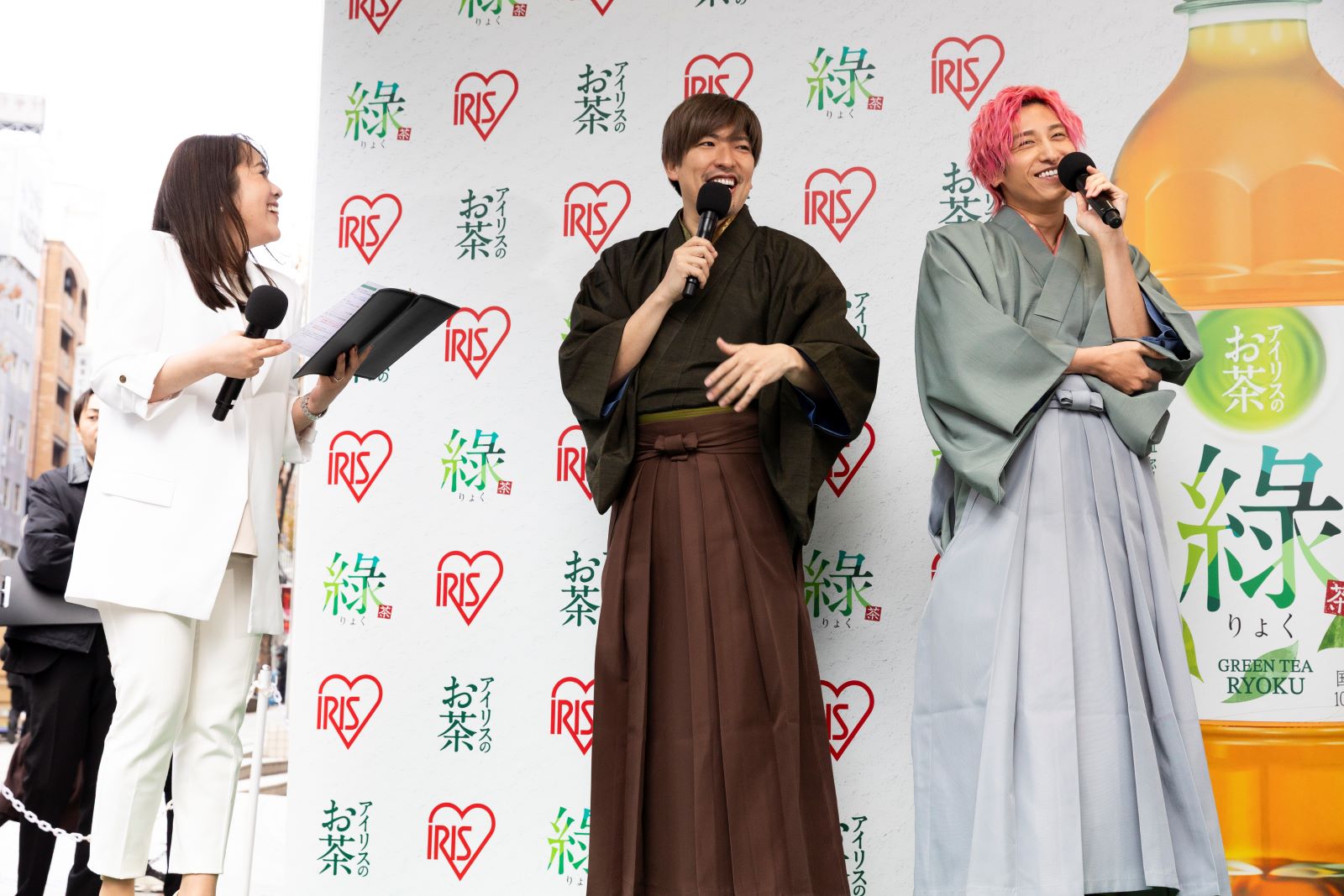 アイリスオーヤマは12月2日、『アイリスのお茶 綠(りょく)』冬のプロモーションイベントをSHIBUYA109渋谷店前で開催した。イベントにはTVCMで吉沢亮が演じる伝説の茶人“お綠さん”の弟子候補として、EXITのりんたろー。と兼近大樹、エルフの荒川とはるが“令和のギャル茶人”に扮して登場した。