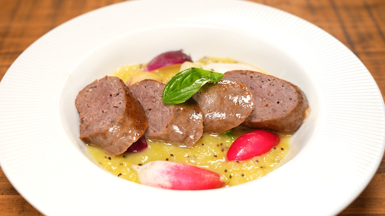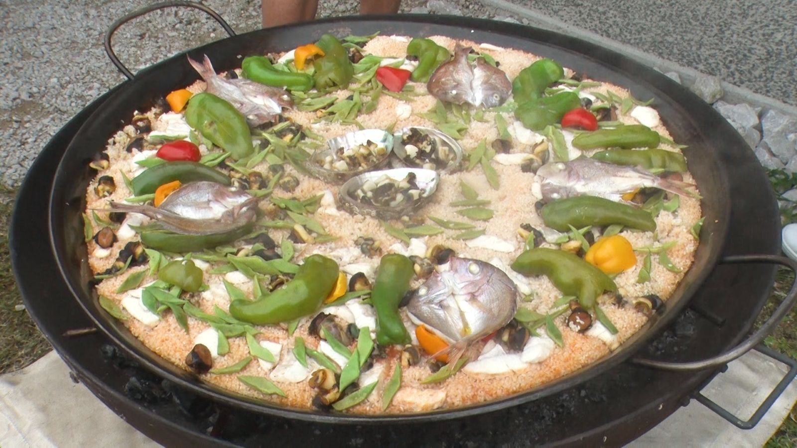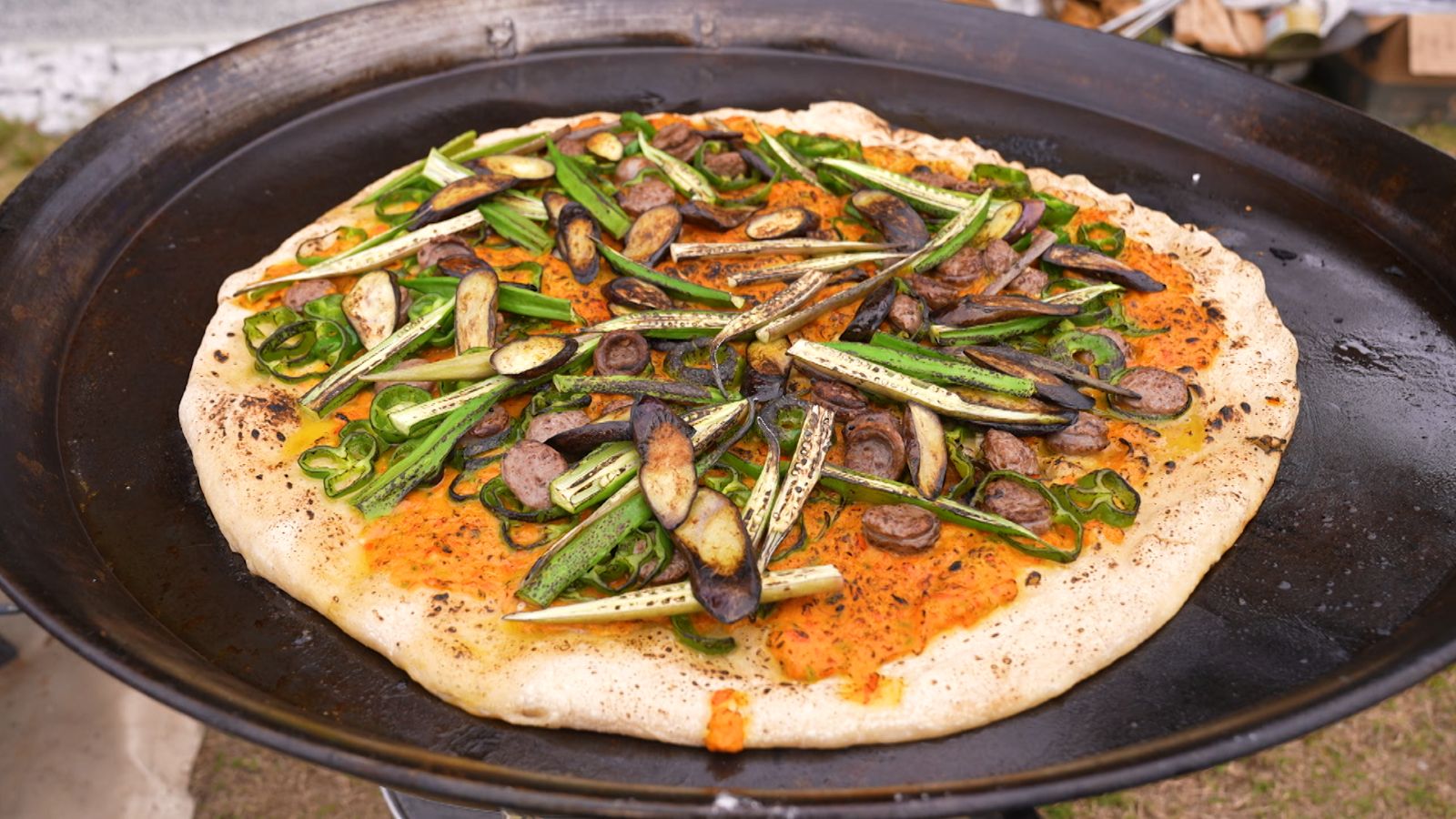 河野シェフが腕をふるったのは巨大フライパンで焼いたピザ。阿武町の名産、バターナッツかぼちゃとパプリカでピザソースを作り、無角和牛のサルシッチャや、ピーマン、オクラをたっぷりトッピング。MY包丁を14本も持つという“料理男子”の大橋も、無角和牛のサルシッチャに名産のキウイソースを添えた料理などを作り上げる。さらに米4升を使い、たっぷりの野菜、ウスバハギ、サザエ、アワビなどを入れた超豪華パエリアも完成。