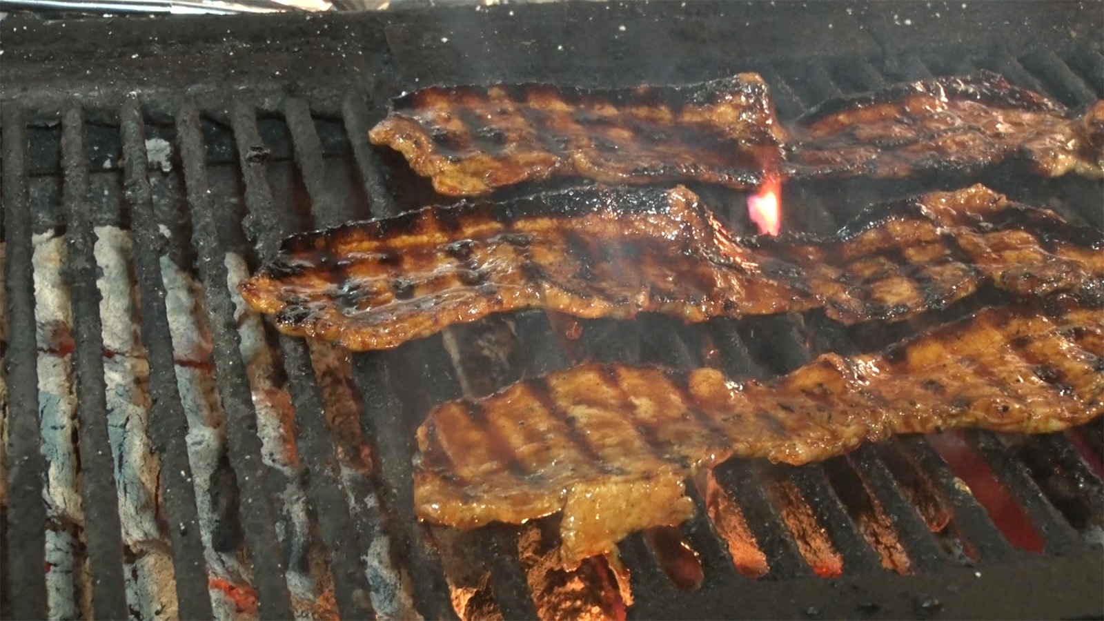 そして、味のキモとなるタレ作りに使用するのはきび砂糖。カラメル状態になるまで煮詰め香ばしさとコクを出す。さらに水と日本酒とみりんを入れ、甘さとコクをプラス。ここで初公開の神ポイントは、なんと隣の油そばで使用しているだし汁を入れるところ。実は、根本さんは『どんぴしゃり』のお隣にある人気油そば店『図星』の生みの親でもある。油そばで使っている鯖節(さばぶし)の出汁をタレにプラス。さらに特製しょうゆ、アップルビネガー、仙台味噌、さらに水飴(みずあめ)を入れてコクととろみを追加し、香り付けに青森県産ニンニク。2日間寝かすと、熟成したタレが完成。さらに炭火で、低温調理されている肉の表面を焼き、柔らかい食感に。