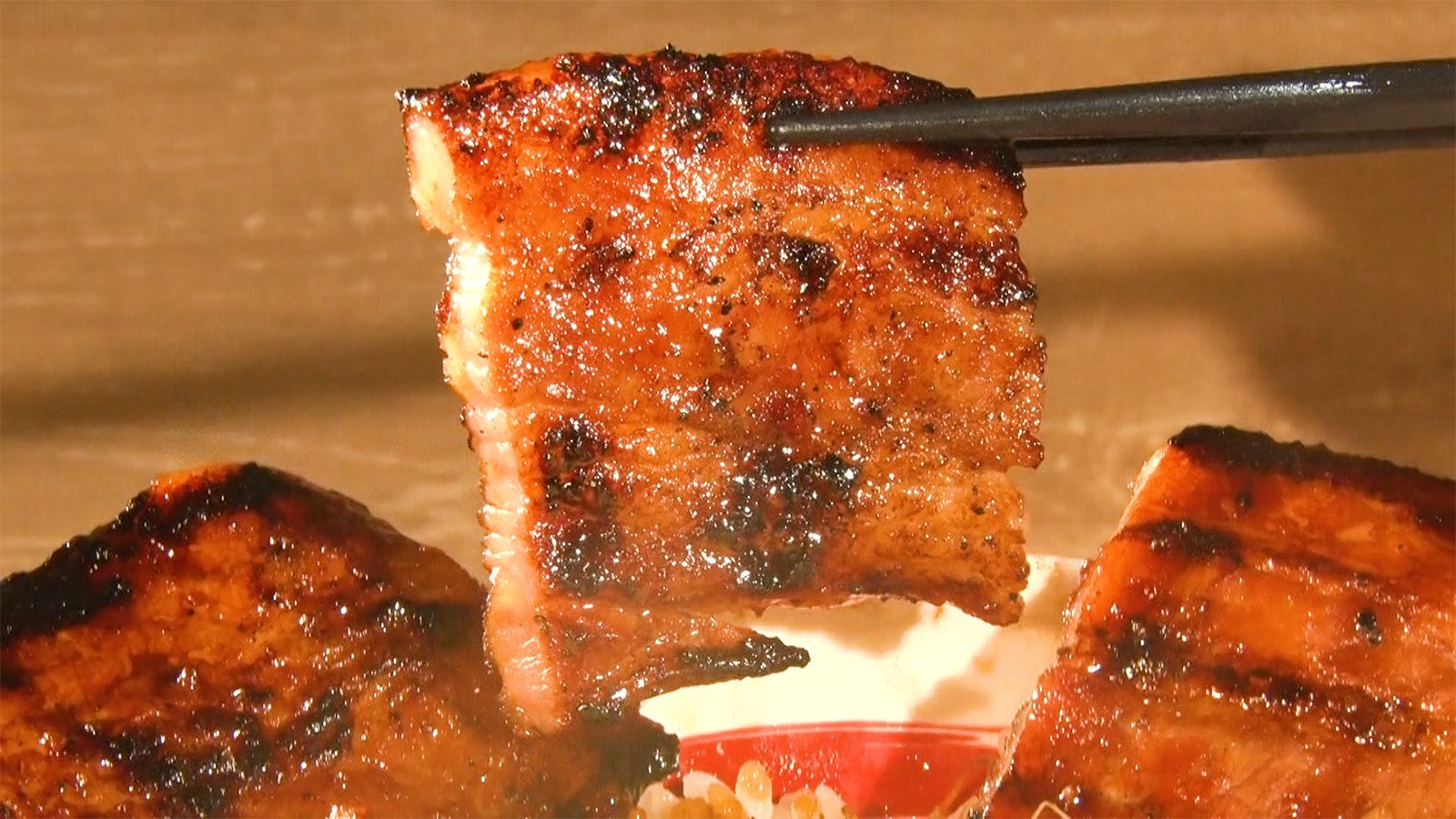 ワセメシランキング1位の神・豚丼の調理法をTV初公開。使用するのは根本さんが自ら厳選した千葉県産の豚バラ肉。8ミリにスライスするのが、1番おいしく感じる食感になるという。豚バラを酒やリンゴを入れた調味液につけこみ、真空パックの中へ入れるのだが、その入れ方だけは企業秘密。真空状態で低温調理したのち、冷蔵庫で5日間寝かせ、肉を極限まで熟成させる。