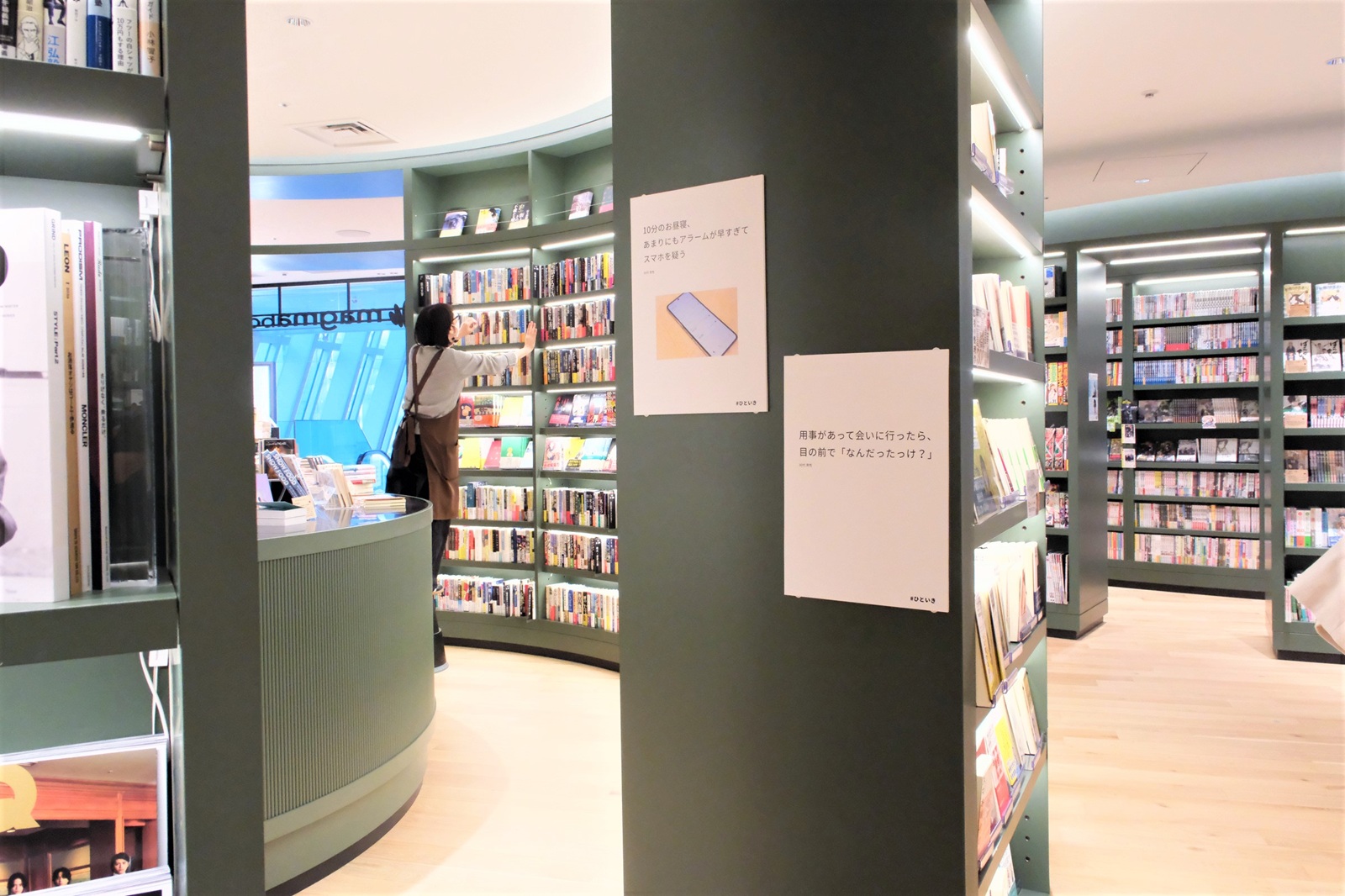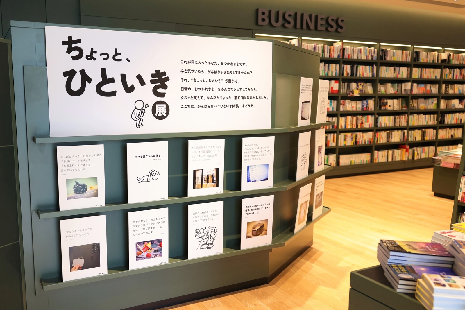 3階の書店内には一般の方から寄せられた”おつかれさま”なエピソードを展示。「打ち合わせで『一瞬だけ共有してもいいですか?』が5回目」「chatGPTからの励ましで泣きそうになる」。ブラックユーモアからほっこり系まで、思わず「わかる!」と頷(うなず)いてしまう。