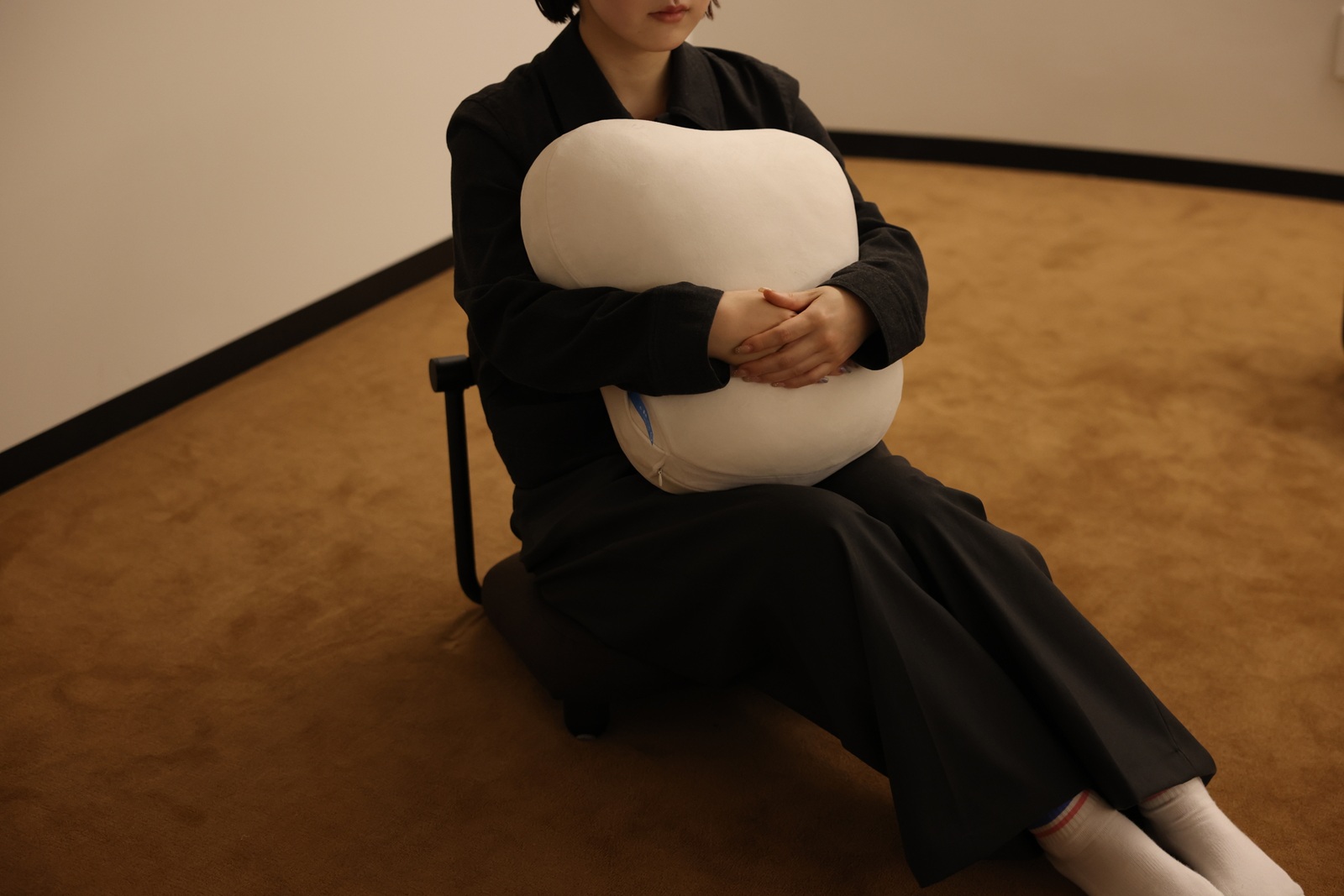 fufulyは、抱きかかえて使う呼吸誘導型のロボットクッションだ。「呼吸の引き込み現象」に注目し、まるで呼吸をするように膨らんだり縮んだりする動きによって、普段あまり意識していない自分の呼吸を意識できるようになるという。