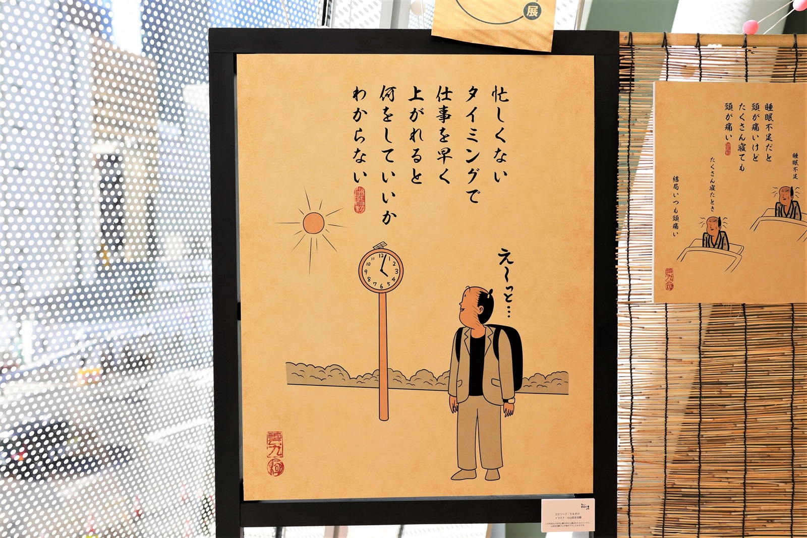 「Wi-Fiがつながらなくて心が折れる」「返信無限ループで既読スルーが罪のように感じる」。現代人の”あるある”がクスッと笑える中にも”自分ごと”として刺さる。日常、仕事、子育てなど様々なシチュエーションを描いた大小の作品を楽しみながら、自然と心のこわばりがほどけるような空間だ。企画展限定のオリジナルグッズも販売。日常の”ひといき時間”に寄り添うアイテムとして、ドリップコーヒー、アクリルキーホルダー、ステッカーなど、ここでしか手に入らない”おつかれさまグッズ”が用意されている。