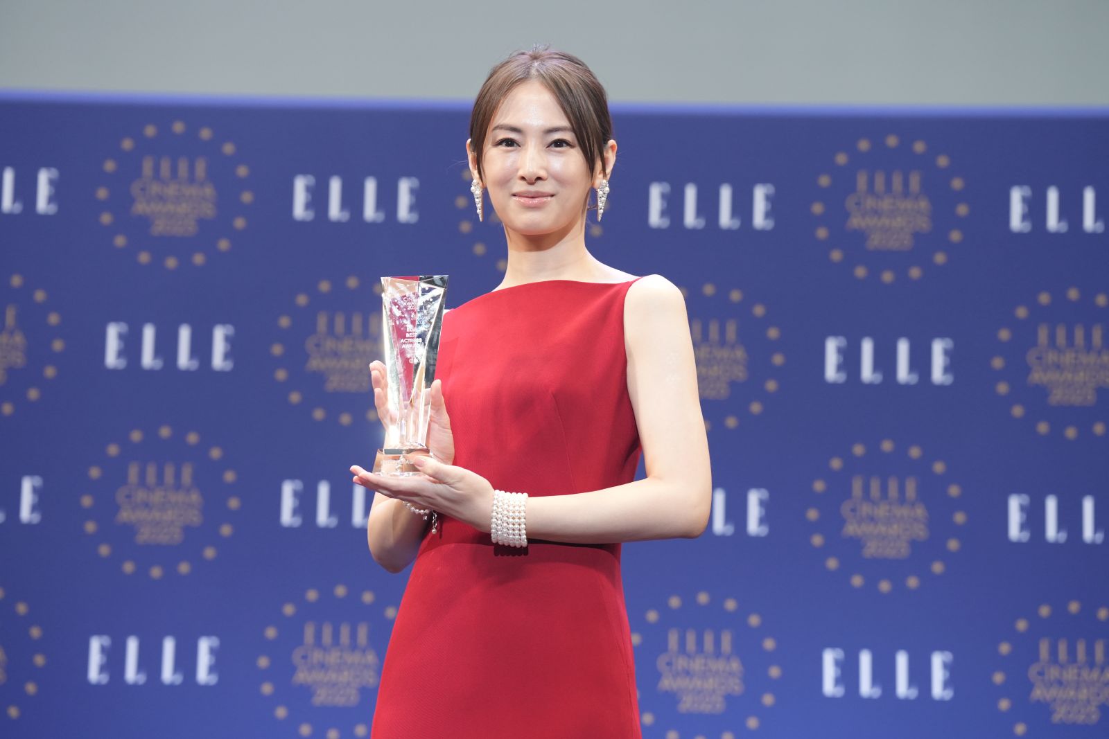 賞の最後を飾る「エル ベストアクトレス賞」を受賞したのは『ナイトフラワー』。現代のシングルマザーが置かれた過酷な状況を映した難しい役に挑戦し、これまでに見たことのない姿で演技派としてのさらなる新境地を見せた北川景子。赤のドレスで登場した北川は「デビューして22年になりますが、主演で映画賞を頂くのが今日が初めてでして、本当に本当に嬉しいですし、このトロフィーの重みを感じています」と心からの喜びと共に受賞のお気持ちを話したのち、「この作品のオファーを頂いた時、相当な覚悟を持って挑まないといけないなと思いまして、今までの自分の能力は無視で、魂で、全身全霊でぶつかっていく気持ちでやりました」と振り返った。最後に「すごくヘビーな作品と役が続いていたので、そろそろ幸せな役がやりたいなと思っています(笑)。そのためにも健康を維持しつつ、家庭に軸足を置きながら、充実した生活を送れたら良いなと思います」と今後の俳優としての意志を表明した。