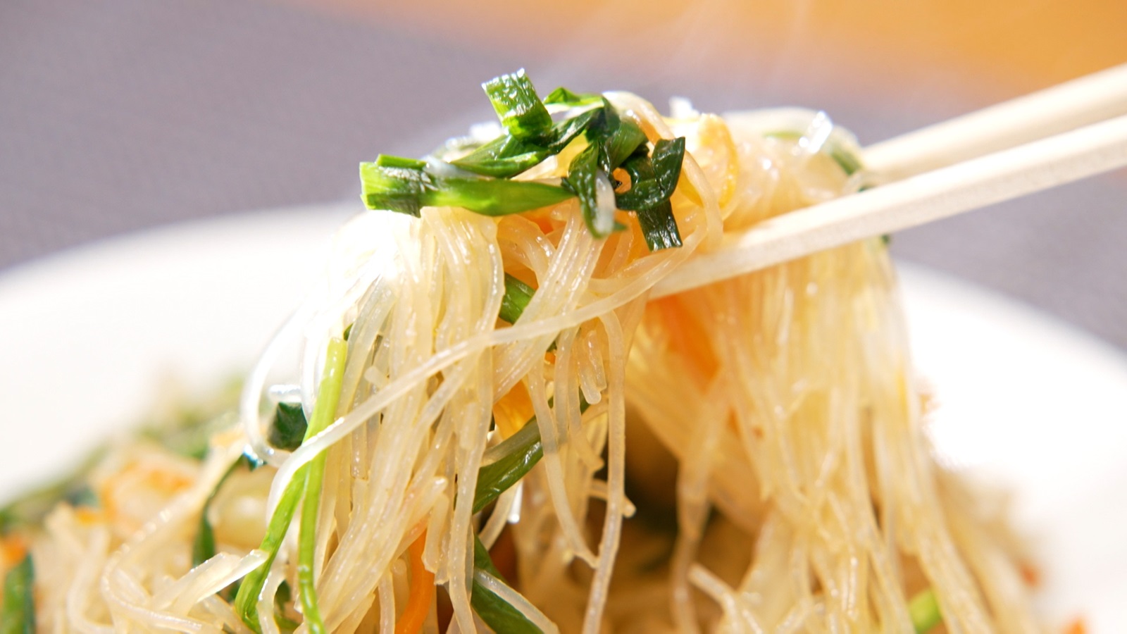 『チャプチェ』のレシピにも輝の里のこだわりが。細切りしたにんじんと玉ねぎを炒め、たっぷりの酒と鶏ガラスープの素で味を整えたら、戻した春雨4kgを投入。味付けはオイスタソースとしょう油を組み合わせ、コクのある甘味を出すのが輝の里流。最後にたっぷりのニラを加えれば完成。