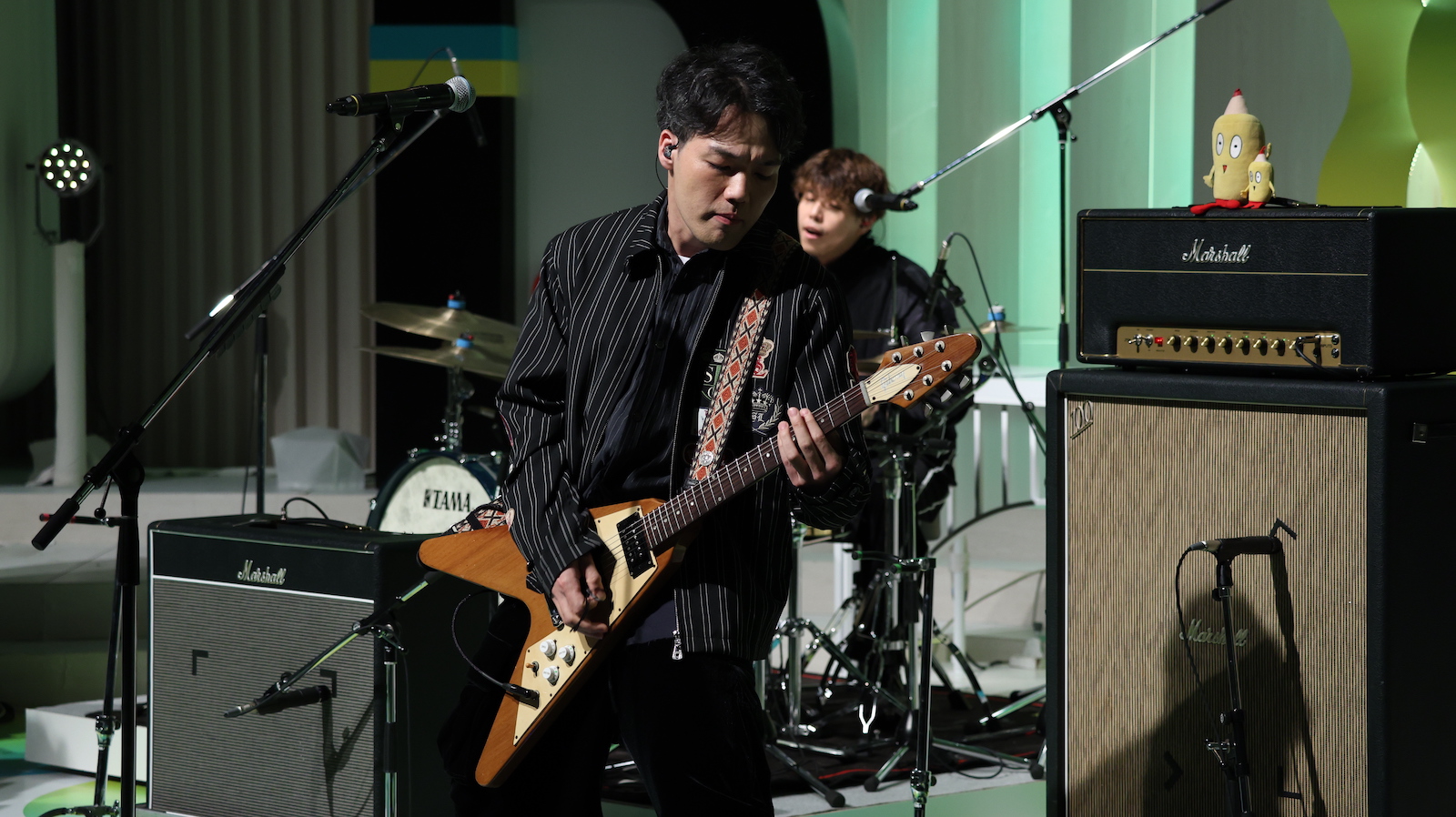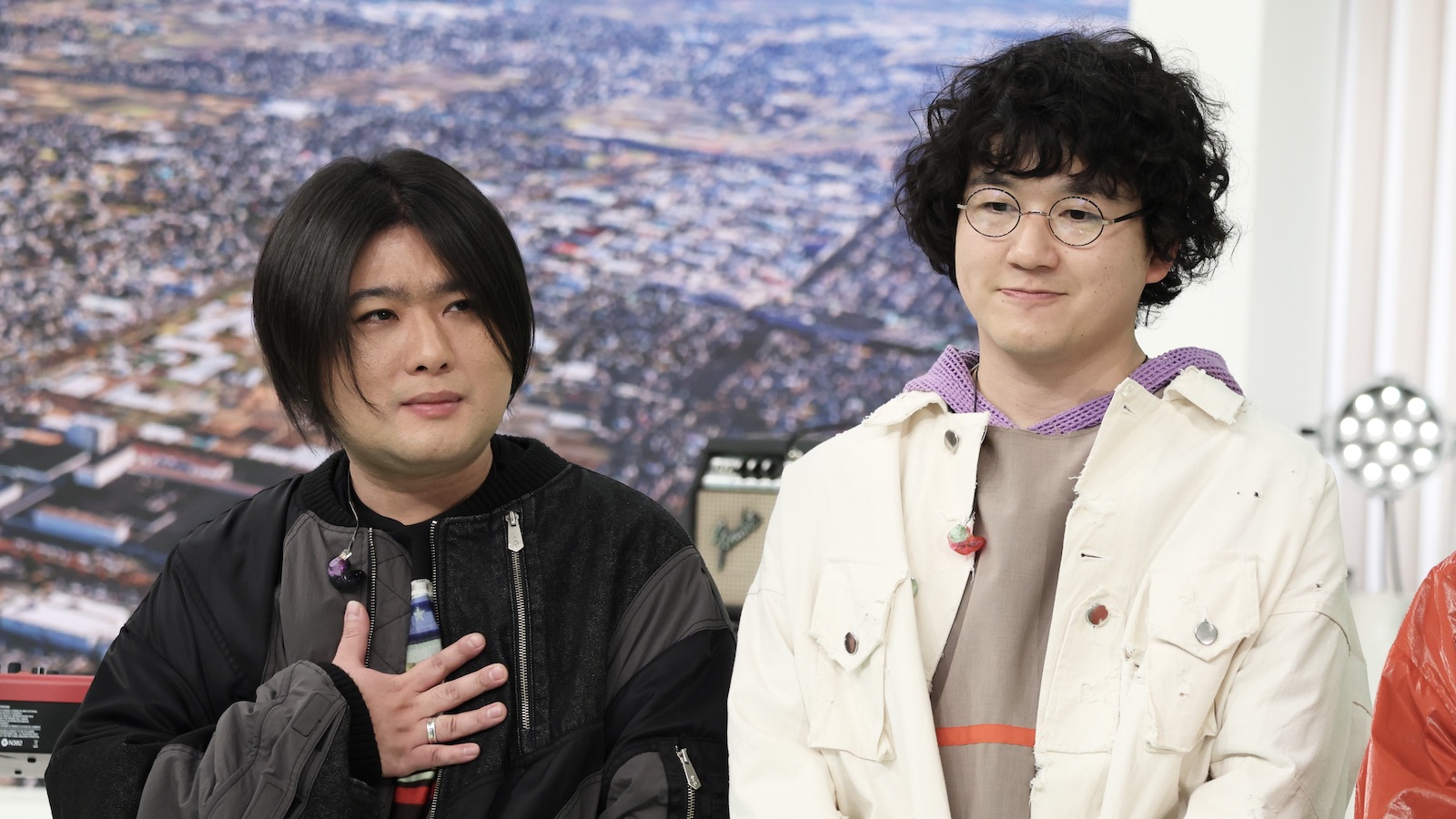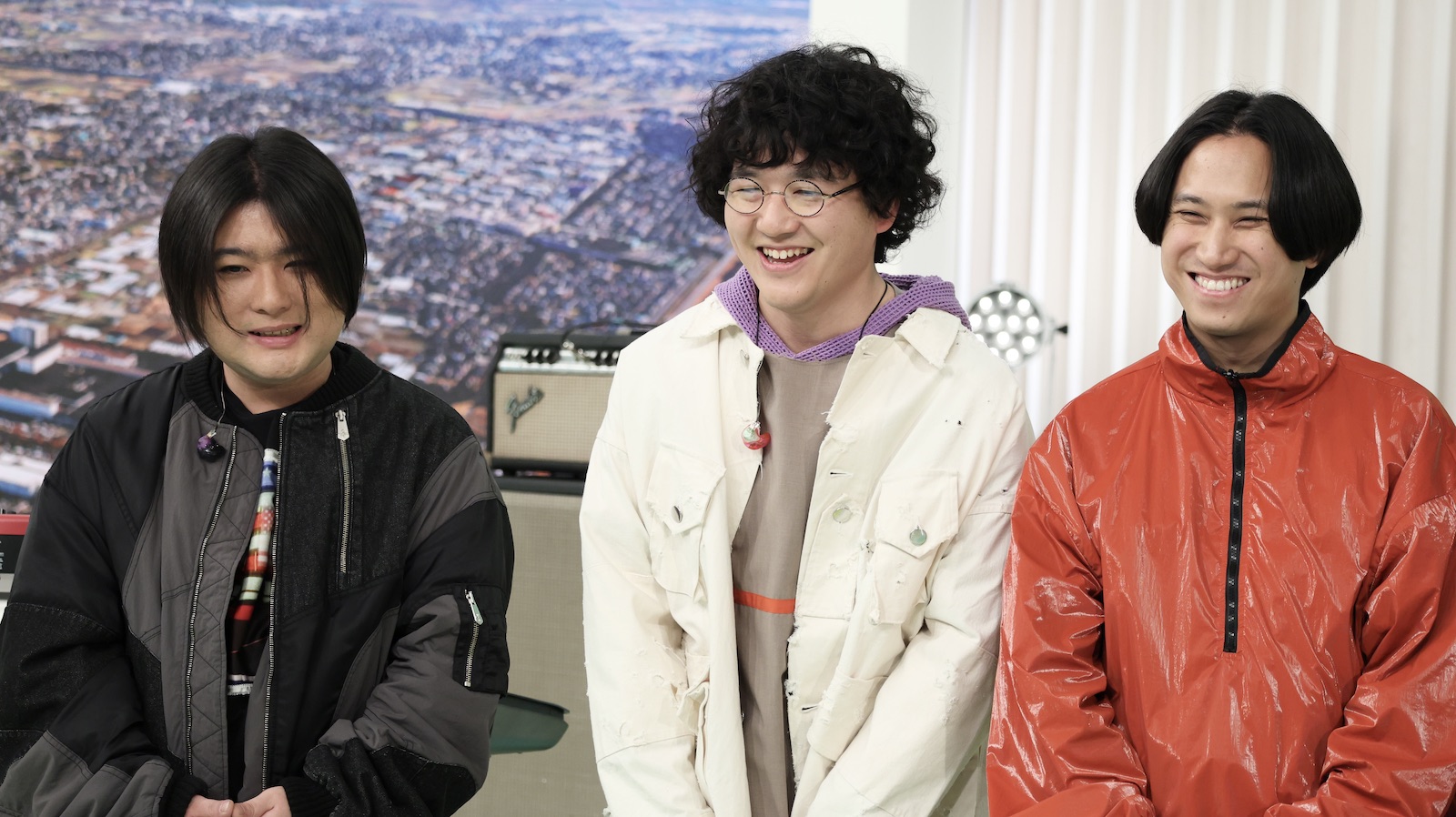 はっとり(Vo.&Gt.)の出身地・山梨県中央市では夕方5時のチャイムにマカロニえんぴつの『青春と一瞬』が採用され、毎日流れているという。はっとりは「フジファブリックの志村正彦さんも同じ山梨県出身で、富士吉田市で曲が使われています。その時から“ロックバンドが5時のチャイムかっこいいな”っていう憧れがあったので、自分ができるってことがキャリアの中でも“愚直にやってきたおかげかな”とも思って、じんわり感動していますね」とうれしさを語った。