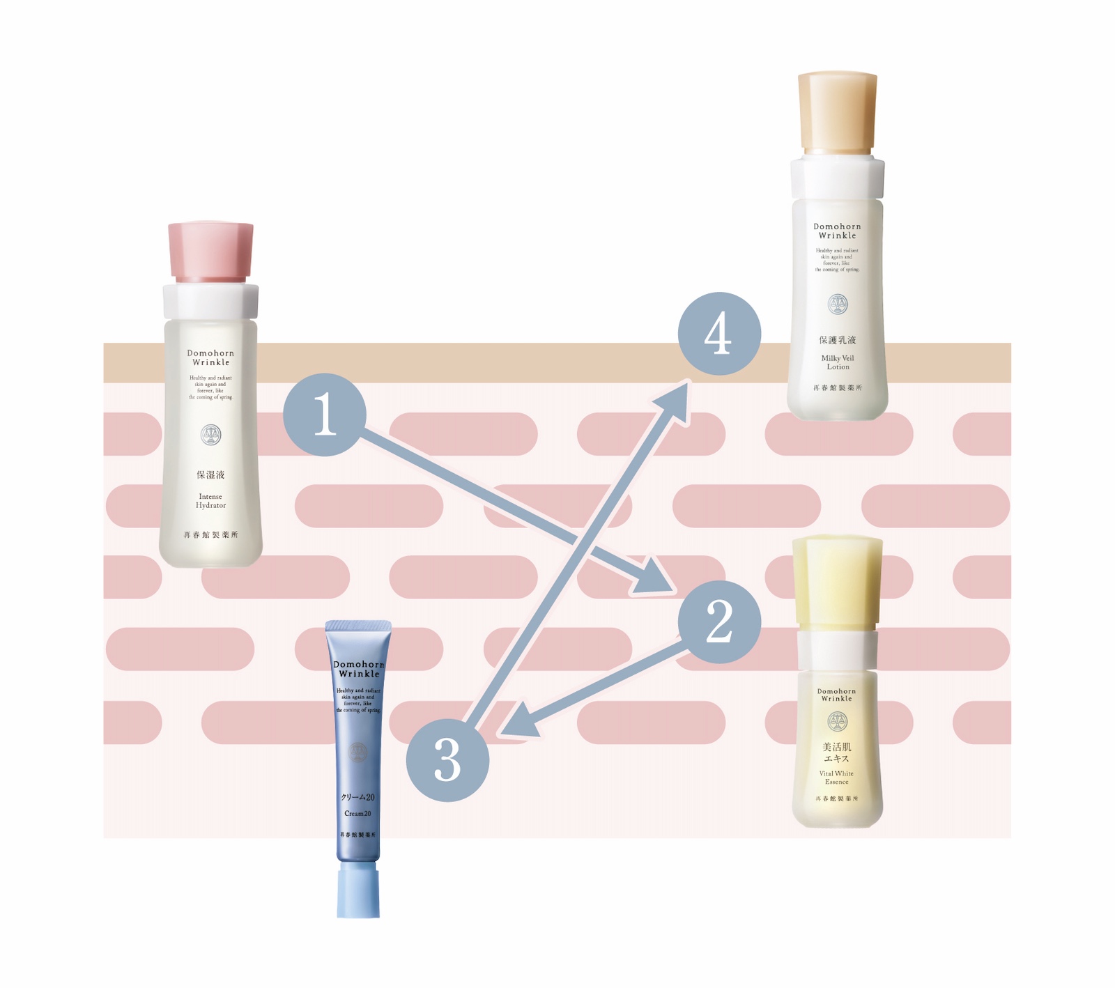 ドモホルンリンクルは、1974年に日本で初めて¹基礎化粧品の成分としてコラーゲン²を配合し誕生した1本のクリームを原点とする、漢方の製薬会社発スキンケアブランド。その名前には、Domo:ラテン語で「制御する」、horn:ドイツ語で「角質(ごわついた状態)」、Wrinkle:英語で「シワ」という3つの言葉を組み合わせた「年齢に負けない肌づくり」という想いが込められている。