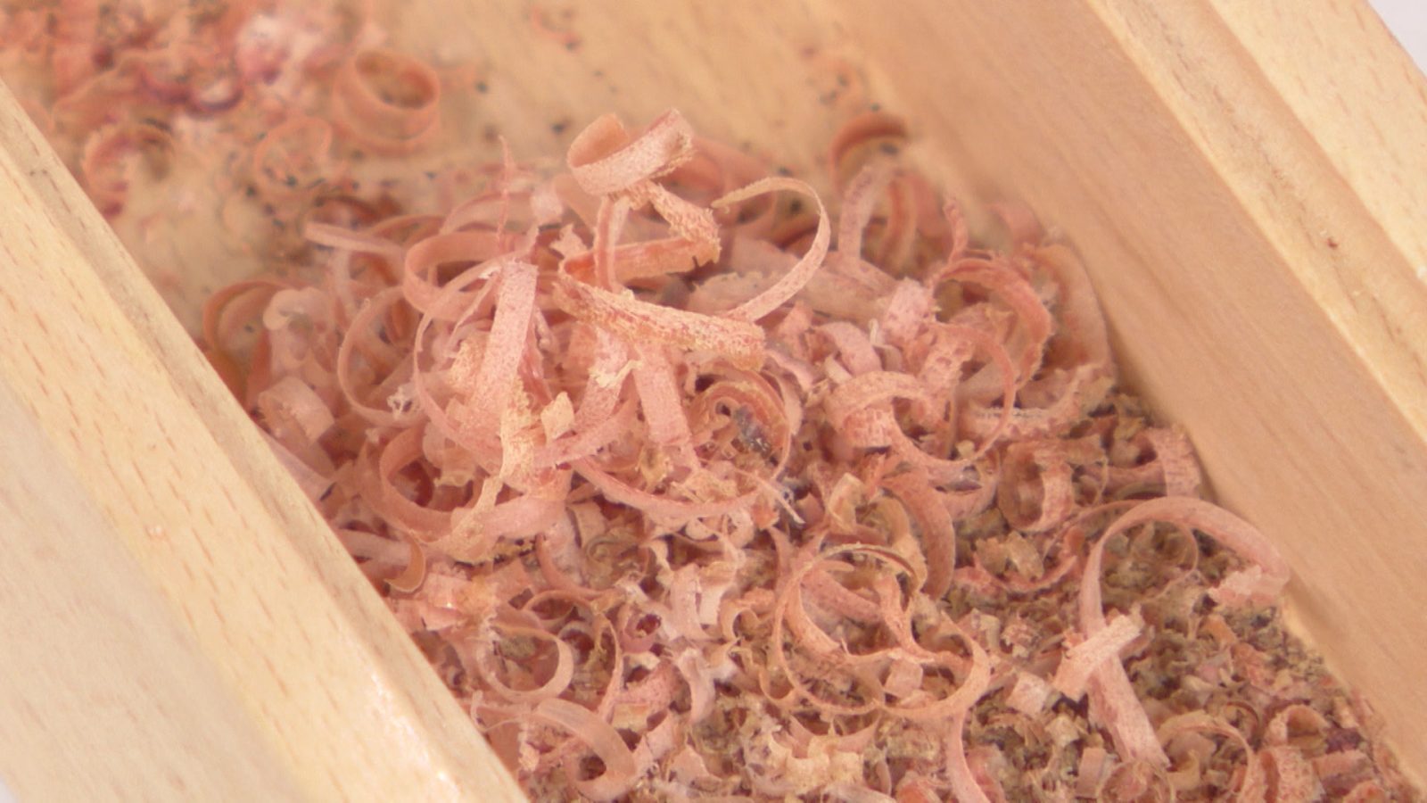 台屋の糸ケズリ(1万1000円)は、ものすごく細い鰹節(かつおぶし)を作れる道具で、おいりさんが移住した新潟県三条市で出会った道具だという。通常の鰹節は出汁を取るために幅の広いモノが多いが、この糸ケズリはカンナの刃にスリットが入っており、そのため細い鰹節ができるのだという。普通の鰹節との違いは、食べた時の食感。糸ケズリで作った鰹節は、食べ物と一体化して食べることができるので、そこが魅力だという。