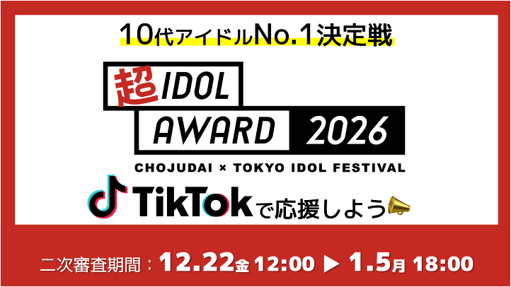 10代アイドルの頂点を決める新たな企画『超アイドルアワード2026』が現在開催されている。本アワードは、ティーン向けカルチャーフェス『超十代(ULTRA TEENS)』と、日本最大級のアイドルフェス『TOKYO IDOL FESTIVAL(TIF)』がタッグを組んで実施。次世代を担う10代アイドルにスポットを当てた注目企画。選考は複数の審査を経て進行しており、現在は第二次審査が行われている。