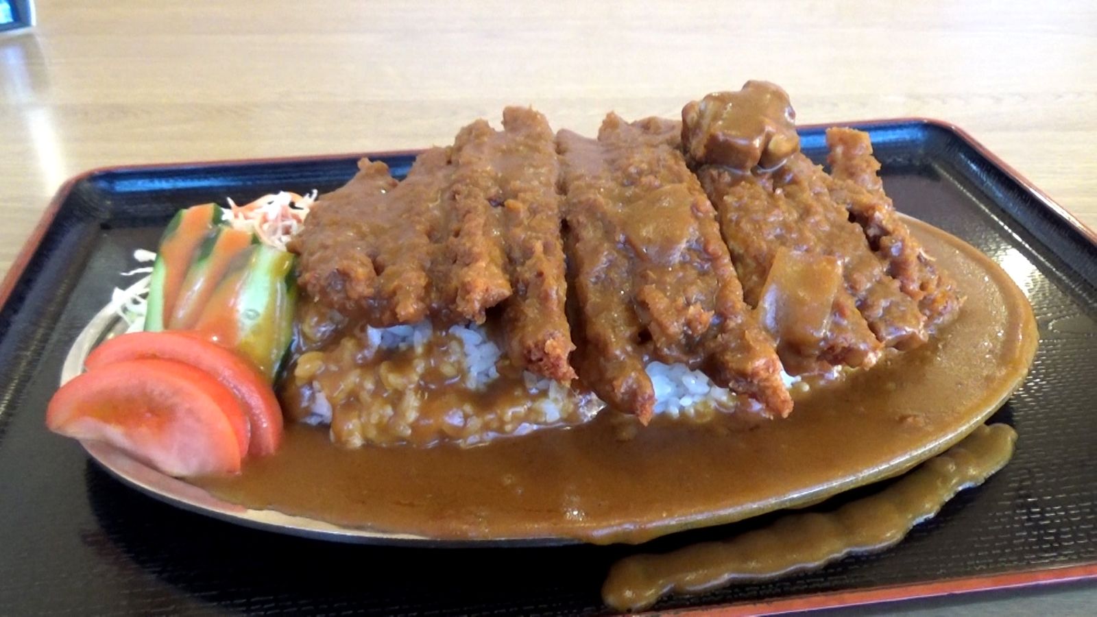 これまでに「白線」担当Dは6軒、「1000回以上」班は1軒の店を発見。「ヤバい、ヤバい、ヤバい」と焦る川添CD。ようやく捜索開始から65日目、垣根に花が咲いている店を発見。実は2か月前にも目に止めていた店で、その時は花が咲いていなかった。2か月経つ間に花が開いたようだ。お店は小城市(おぎし)の『ドライブイン一平』。店内での取材はNGだったが、自分で食べる分を撮影するだけならOKとのこと。大盛で2.5人前相当の『カツカレー』は1,150円。川添CDが初めて佐賀の美食にありつくことができた。