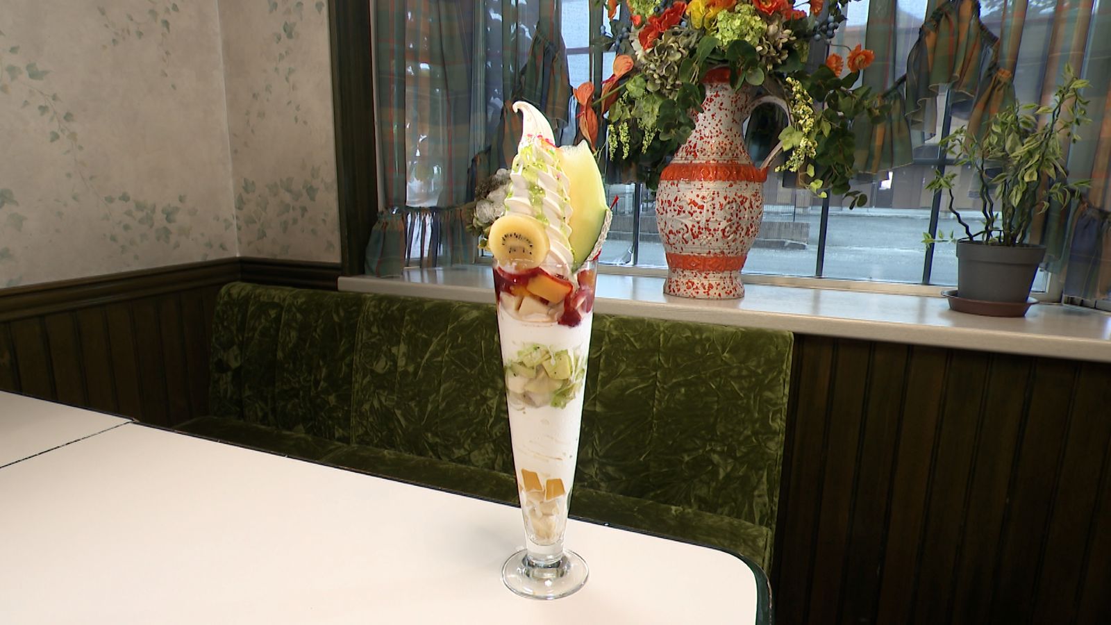 2か月以上の期間をかけて県内をタクシーで捜索したのは、“お花大好き”な川添チーフディレクター。やっと見つけたのは店先に白い花が咲いている店。ところがこの店、すでに「白線が薄い店」として別のディレクターが取材済みだった。鹿島市にある『ぐりるるーむ びぎん』。撮影していたのは『ロングパフェ』(1,300円)。高さ約43cmで季節のフルーツ10種が使われている。スタッフ同士の連携の悪さに、進行の小峠英二が思わず「同じチームで何やってんだよ」とツッコむ。