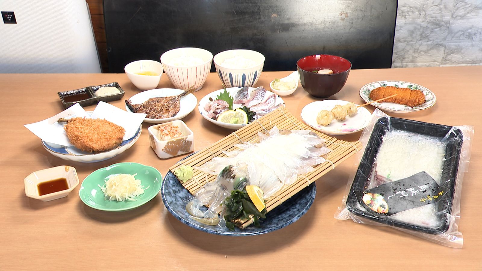 唐津市で見つけた白線の薄い店は『魚てる』。おすすめメニューが『イカの活き造り定食』(3,580円)。さばいたばかりで、まだ動いているイカの活き造りは、佐賀・呼子産のアオリイカ。これにイカしゅうまい、冷奴、ご飯、汁物、お新香などが付く。しかしそれだけではなかった。サービスの料理が次々と追加で運ばれてきて、客たちはビックリ。魚ロッケ、アジの刺し身、イカのトンビ(口)焼き、アジのみりん干し、アジフライなどが、出るわ出るわ。最後には、おみやげの冷凍イカ刺しも渡してくれた。(※サービスは日によって異なります)