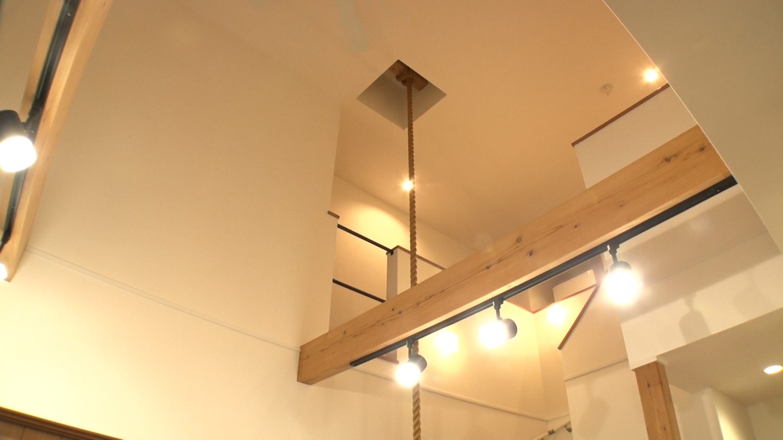 また、2人は吹き抜けの天井から太いロープが下がっているのに気がついた。この全長約6mのロープは、愛果莉さんのトレーニング用なのだとか。間取り図の小さな丸の正体はロープだった。愛果莉さんはロープに手をかけると、腕力だけでどんどんロープを上っていき、あっという間にロープがくくりつけられている柱まで到達した。2人は「すごい!」と言って下から見上げる。下りてきた愛果莉さんはロープで鍛えた腕に力こぶを作り、それを触った村上は「すごい!いい筋肉がギュッてなってる」と言って驚いた。